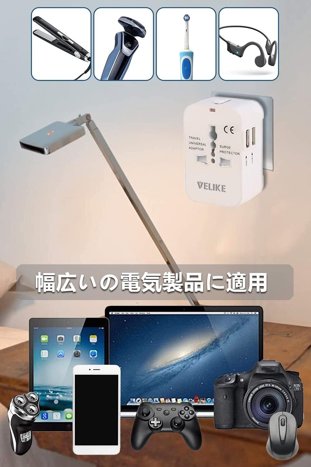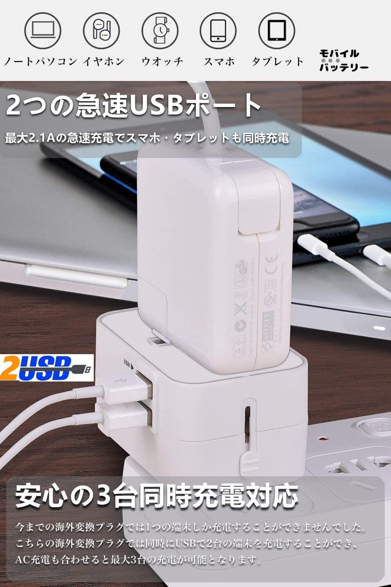 【 一台3役丨急速充電USB×2 】変換プラグはUSBポート "最大6A" (各2.0A)を2個内蔵しているから、およびACコンセントは合計3台のデバイスを同時に急速充電できます。たとえば、スマホ、モバイルバッテリー、タブレット、iPhone、iPad、カメラなどのUSBデバイス。