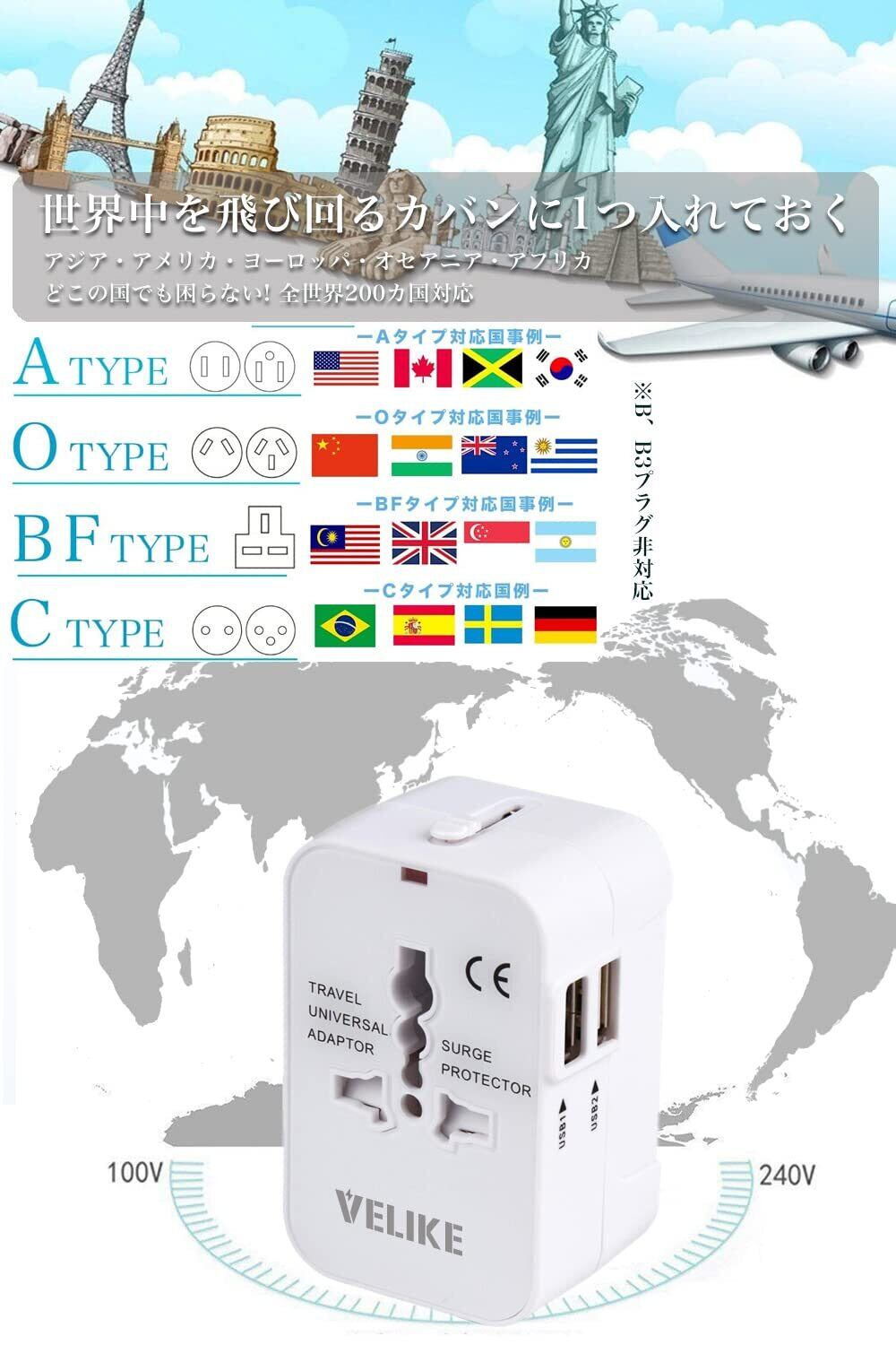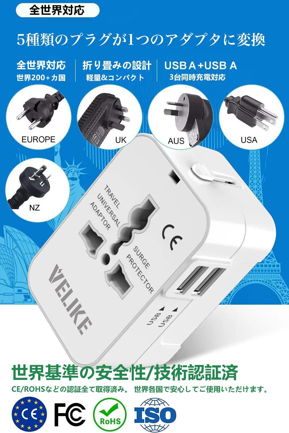 【2025最新】VELIKE 海外 変換プラグ コンセント 海外用電源プラ グ マルチ変換プラグ 2USBポート 全世界対応 変換器 海外旅行用充電器 A/O/BF/Cタイプ マルチアダプター 200ヶ国以上通用 Universal Travel Adapter 経済産業省承認済み 正規1年 (ホワイト)