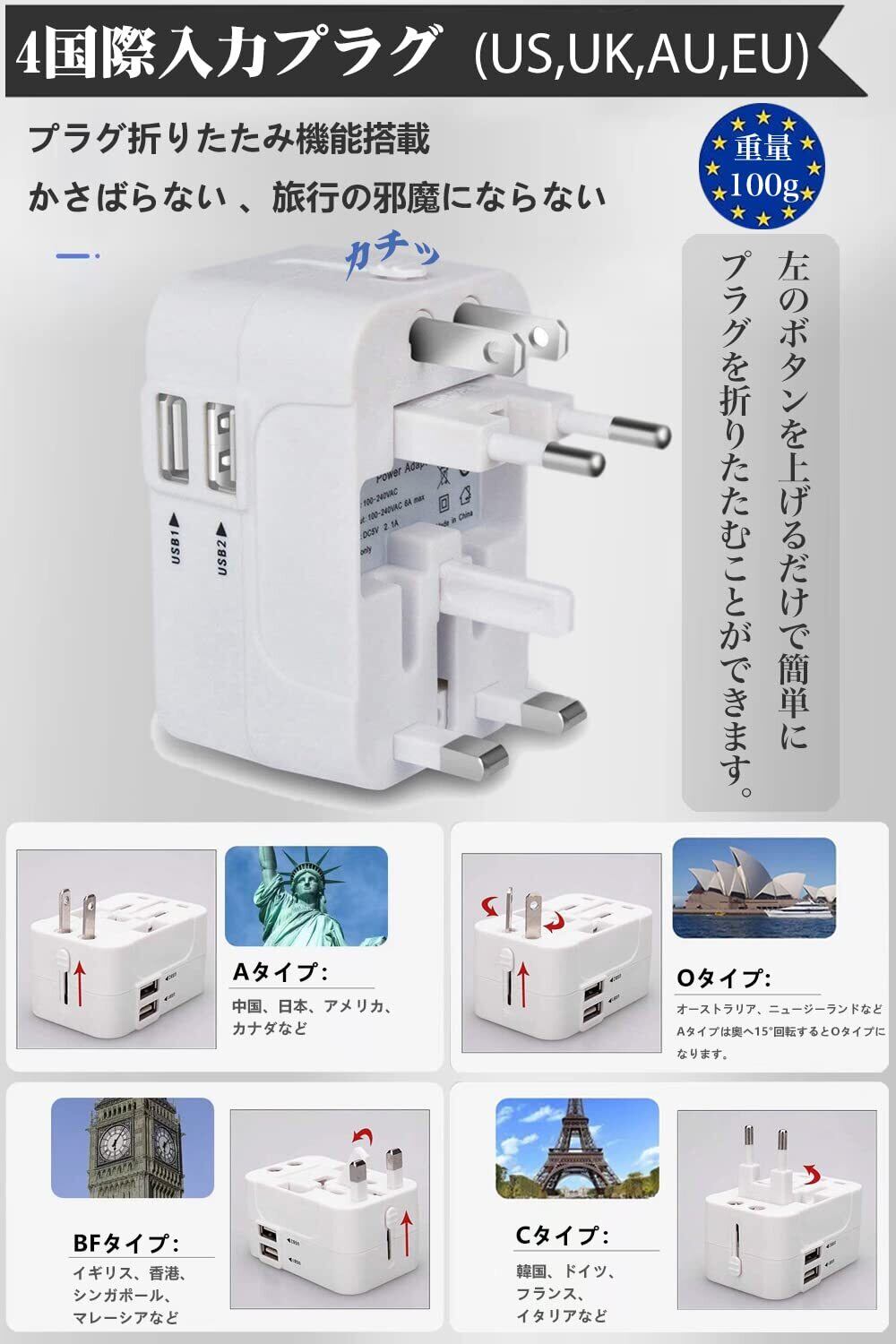 【コンパクトで軽く】この電源変換プラグは小型軽量で、サイズは77×50×39mm、重さは約91gで、また、4種類のプラグ部分を折りたたんで収納でき、場所をとらず、カバンに直接入れても重さも気にせず、旅行の際の持ち運びにとても便利です。海外旅行、出張、留学に最適です。