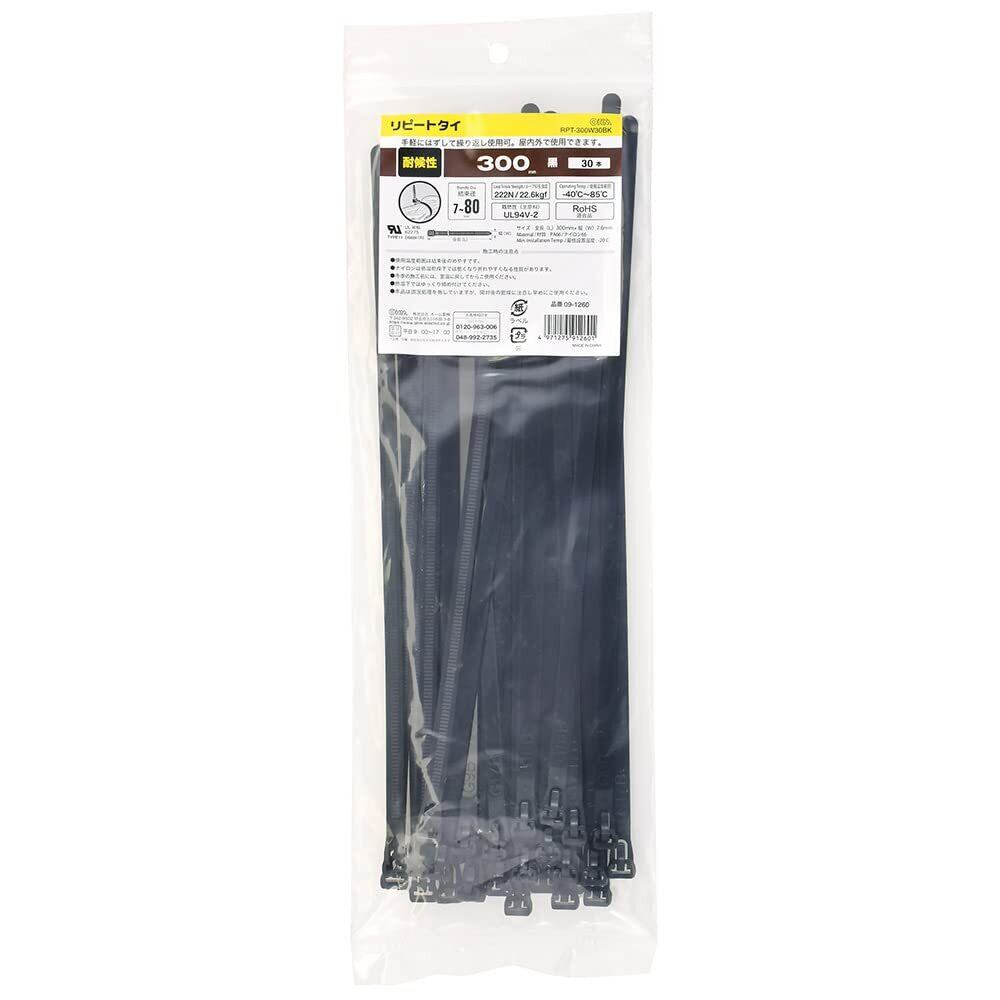 オーム電機 結束バンド リピートタイ くりかえし使える 耐候性 300mm 30本入 黒 RPT-300W30BK 09-1260 OHM