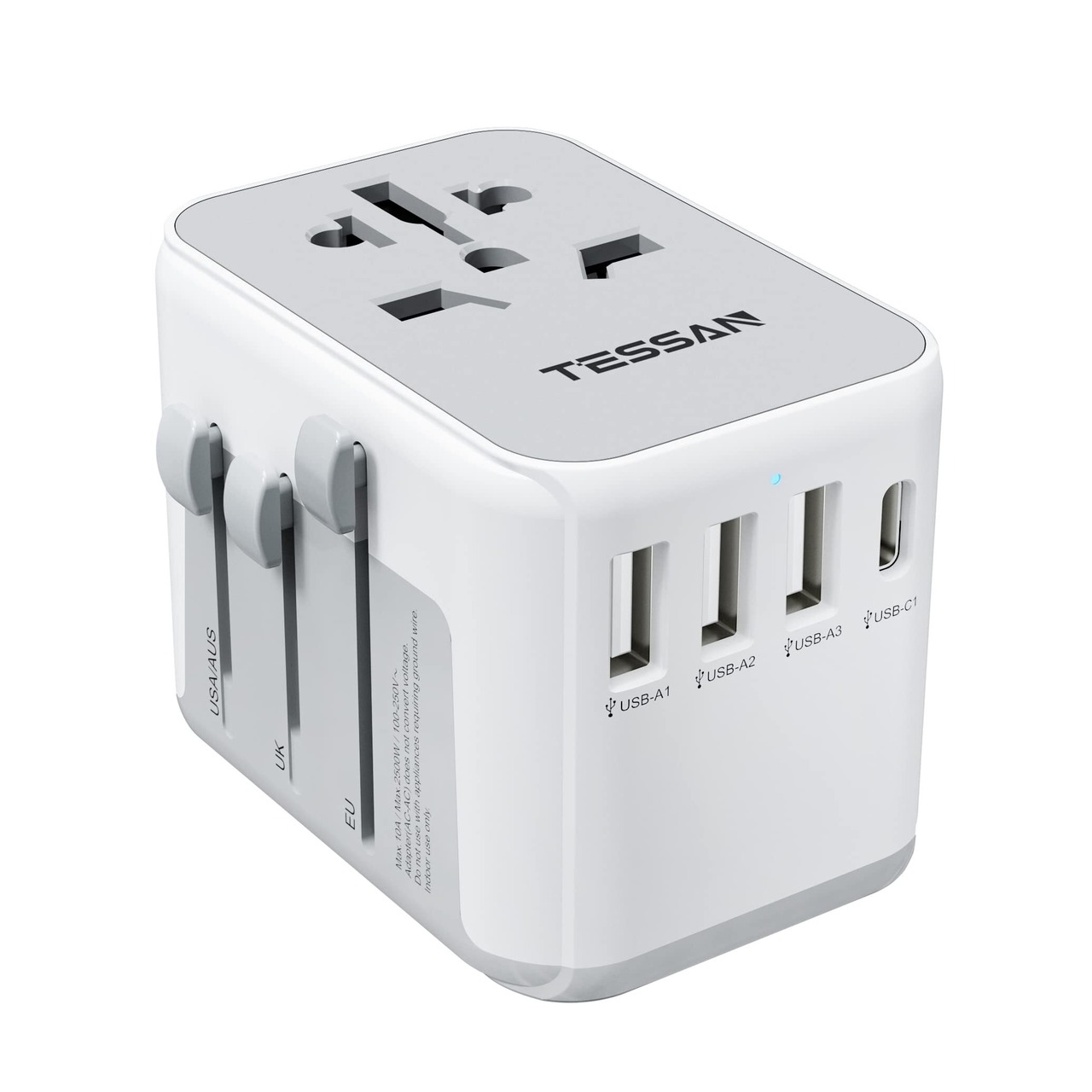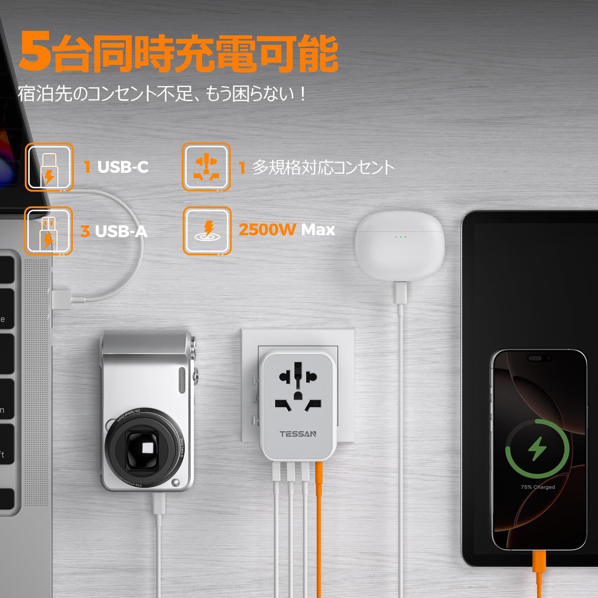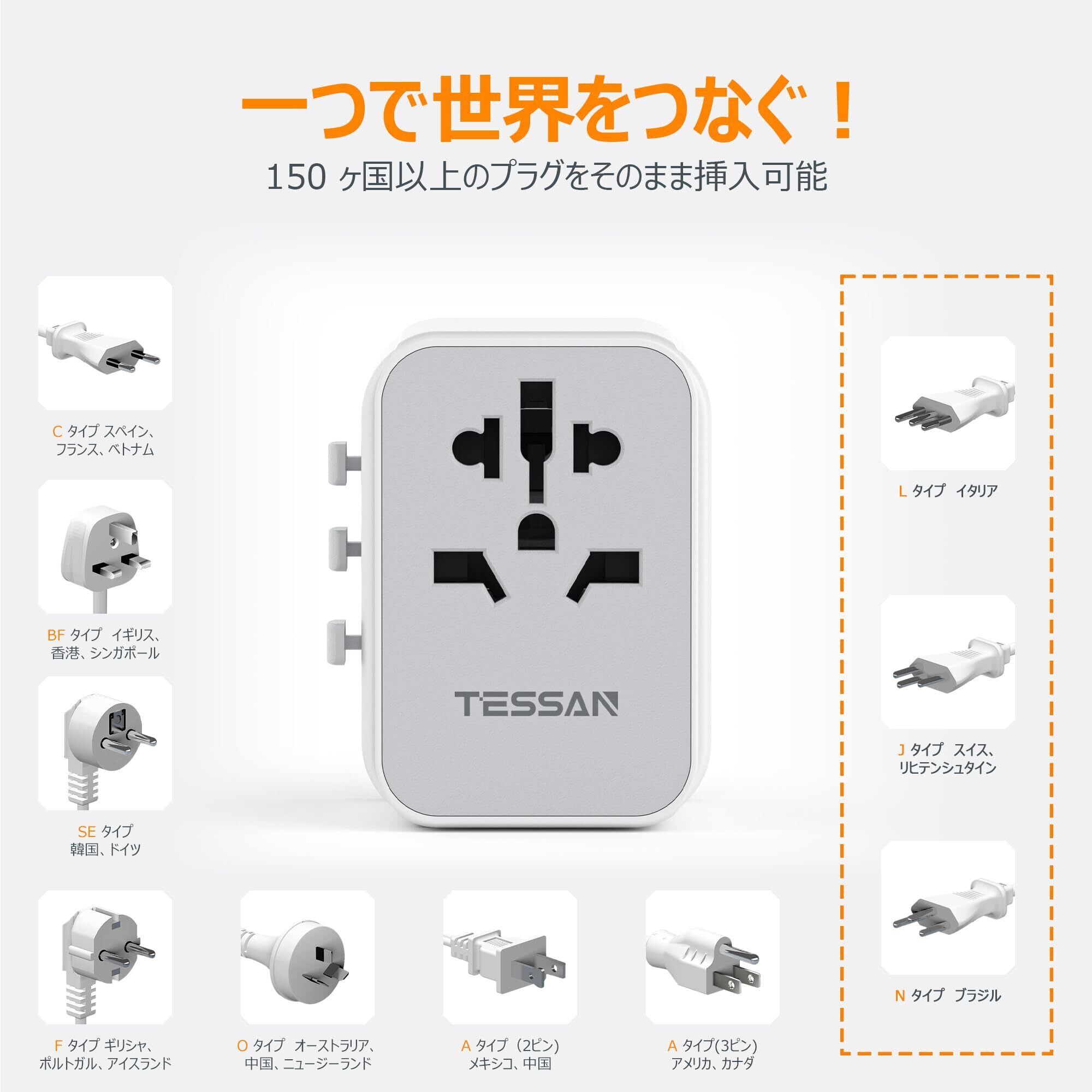 海外 変換プラグ TESSAN コンセント変換プラグ 全世界対応 変換器 A/BF/O/Cタイプ 3つUSB-Aと1つUSB-Cポート付き ヨーロッパ/韓国/イギリス/アメリカ/オーストラリア/中国などの国に対応 海外旅行用便利グッズ トラベルグッズ