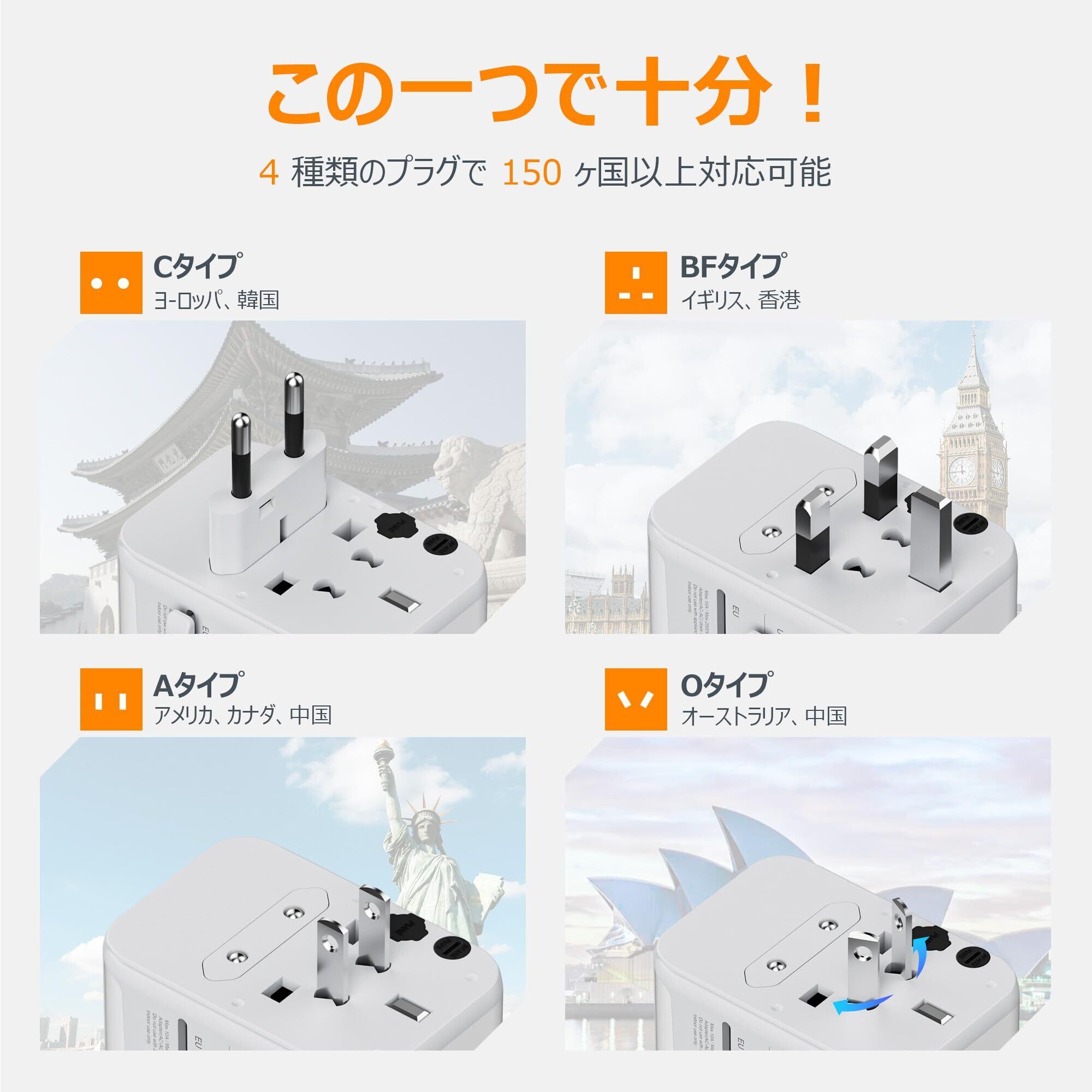 【変換プラグ 全世界対応】Aタイプ・BFタイプ・Cタイプ・Oタイプの4種類のプラグを本体に内蔵し、US・UK・EU・AUSなど、世界各国のコンセント形状に対応しています。アメリカ、イギリス、ヨーロッパ、オーストラリア、韓国、シンガポール、中国、カナダ、東南アジアなど、150以上の国と地域で使用可能。海外旅行や出張先でも、コンセントの形状を気にせず、すぐに電源が使える便利なマルチ変換プラグです。