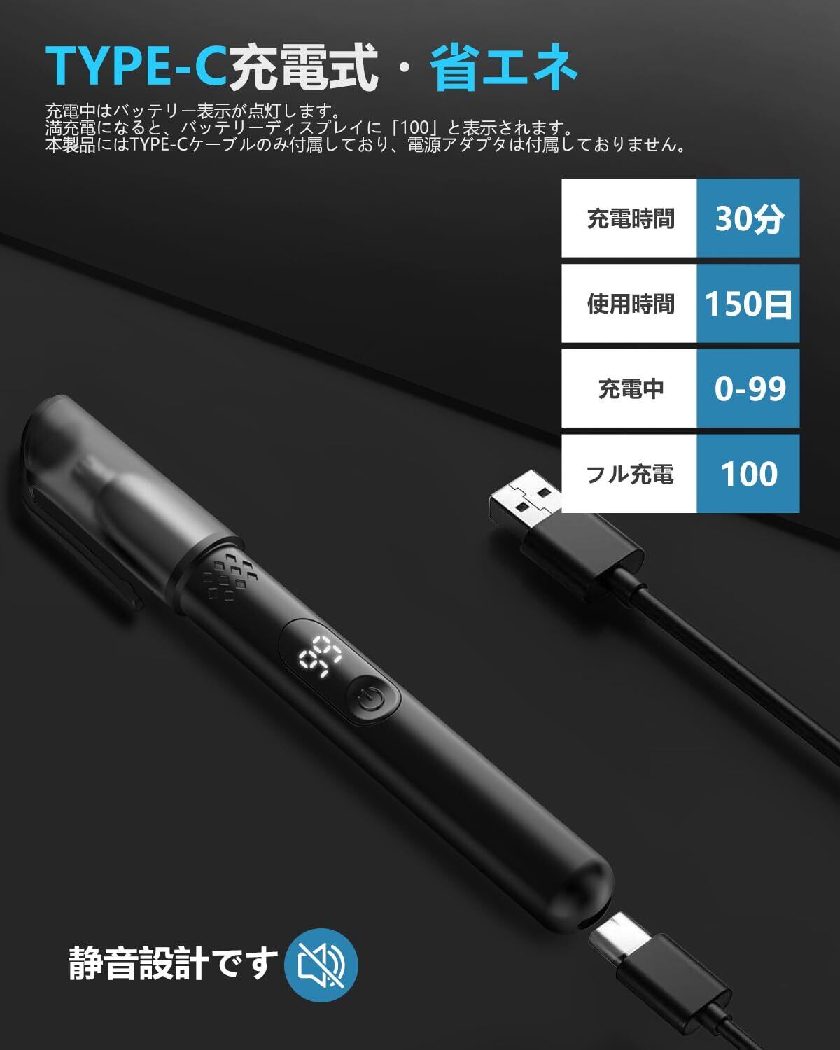 【USB充電式鼻毛カッター】鼻毛カッター メンズは高性能リチウムイオン電池を内蔵しており、付属のType-Cケーブルでかんたんに充電することができます。いつでもどこでもお手軽に充電でき。スマートフォン用のUSB充電器でも充電は可能なので外出先での充電も便利です。