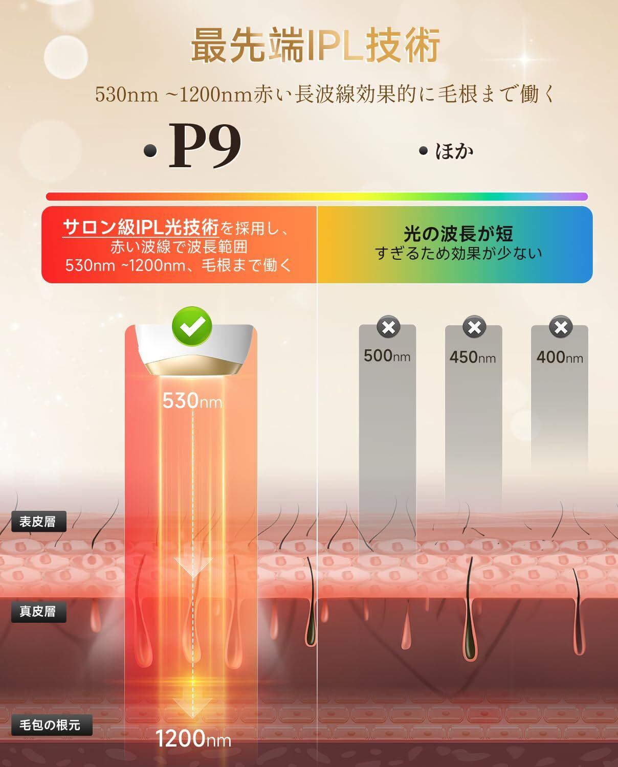 【革新的な IPL 技術と快適な脱毛体験】サロン級 IPL 光技術(530nm~1200nm)を採用し、赤い長波線が毛根まで深く浸透し、6 週間で毛の長さ 80%、密度 92% 減少。日本の肌に最適化された特殊フィルターで刺激を軽減し、5℃~10℃の涼しい照射で痛みを抑え、安全かつ快適に脱毛できます。自動照射機能で滑らせるだけで連射可能で、広範囲 3cm² の照射面積で 10 分で全身ケアが完了します。