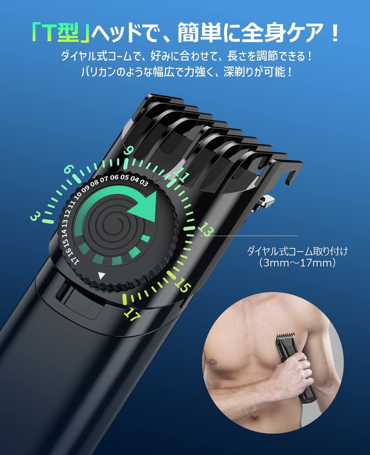 【効率的な幅広「T型」ヘッド設計】バリカンのような幅広「T型」ヘッド設計で、ムダ毛の多い男性でも、普通のカミソリよりスピーディーに剃れます!また、アタッチメント交換なしで、3mmから17mmまで長さ調整が可能なダイヤル式コームが揃っており、デリケートな部分の肌を守りながら理想の仕上がりが叶います。脱毛サロンに通うよりずっと手軽に、自宅でムダ毛処理ができます。