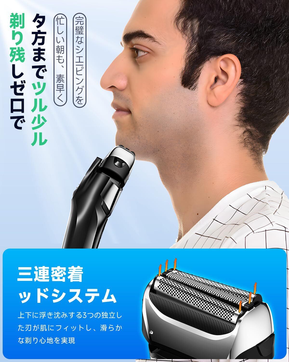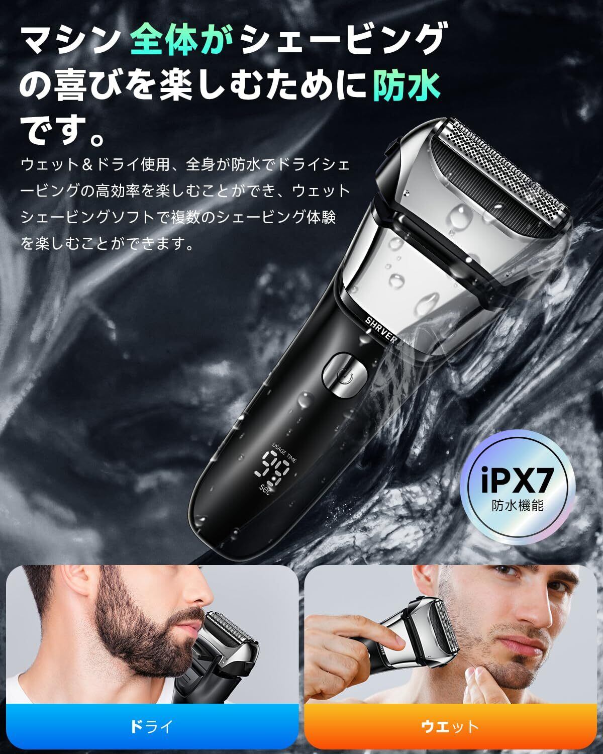 【乾湿両用設計&IPX7 防水仕様】この電動シェーバーは乾湿両用設計で、湿らせて剃るのが好きな方でも、乾いた状態で剃るのが好きな方でも快適に使用できます。IPX7 防水仕様を備えており、全体洗浄が可能で、常に清潔な状態を保つことができます。刃先は簡単に取り外せるので、清掃もしやすいです。