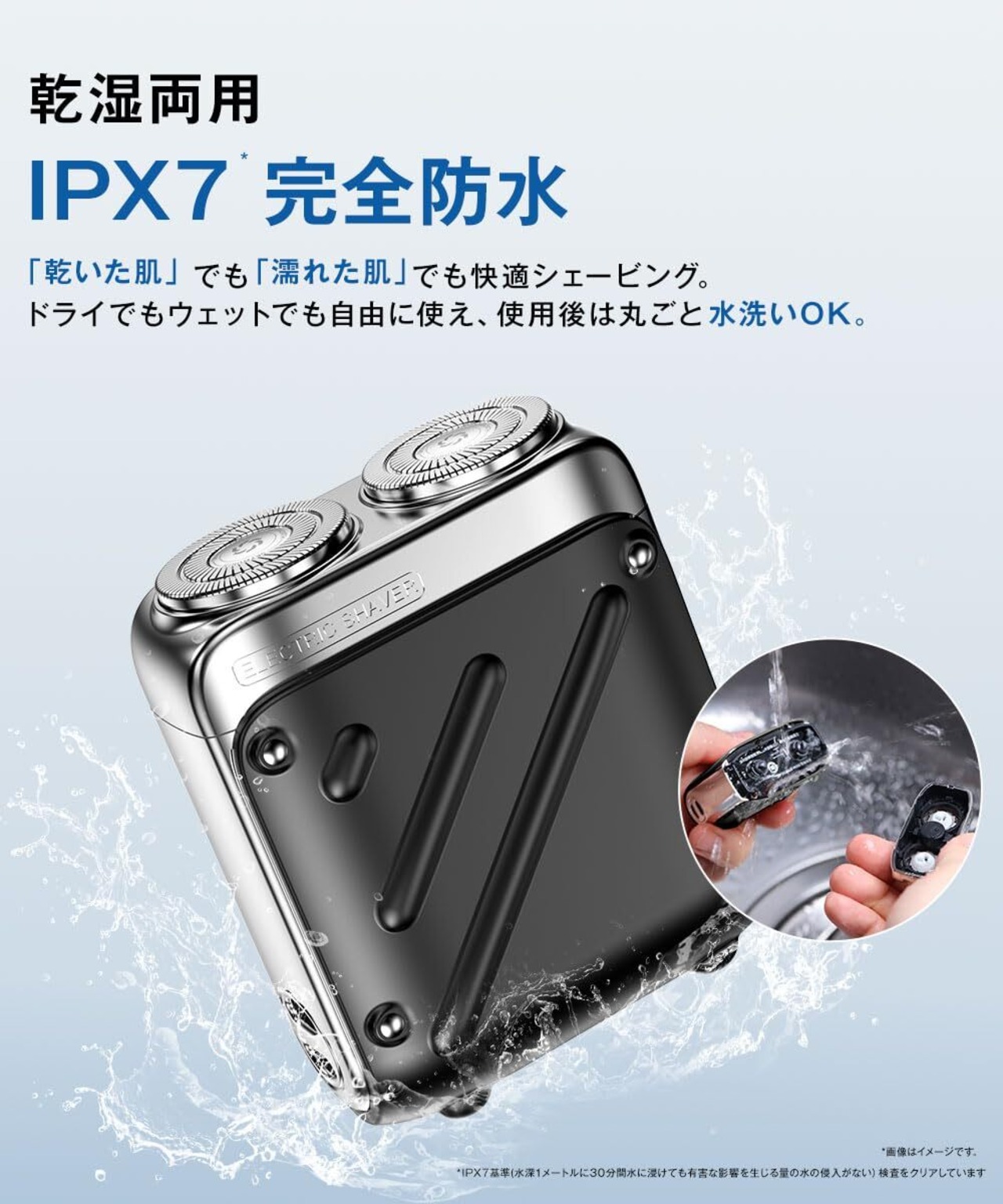 【IPX7完全防水 & 丸洗いOK】 IPX7防水仕様で、シェーバー 本体を丸ごと水洗い可能。ドライ剃りだけでなく、シェービングフォームやジェルを使った ウェット剃り にも対応し、肌への負担を軽減。乾湿両用 設計により、敏感肌の方でも安心して使用できます。使用後はサッと洗い流せるので、ひげそり 後も常に清潔な状態をキープできます。