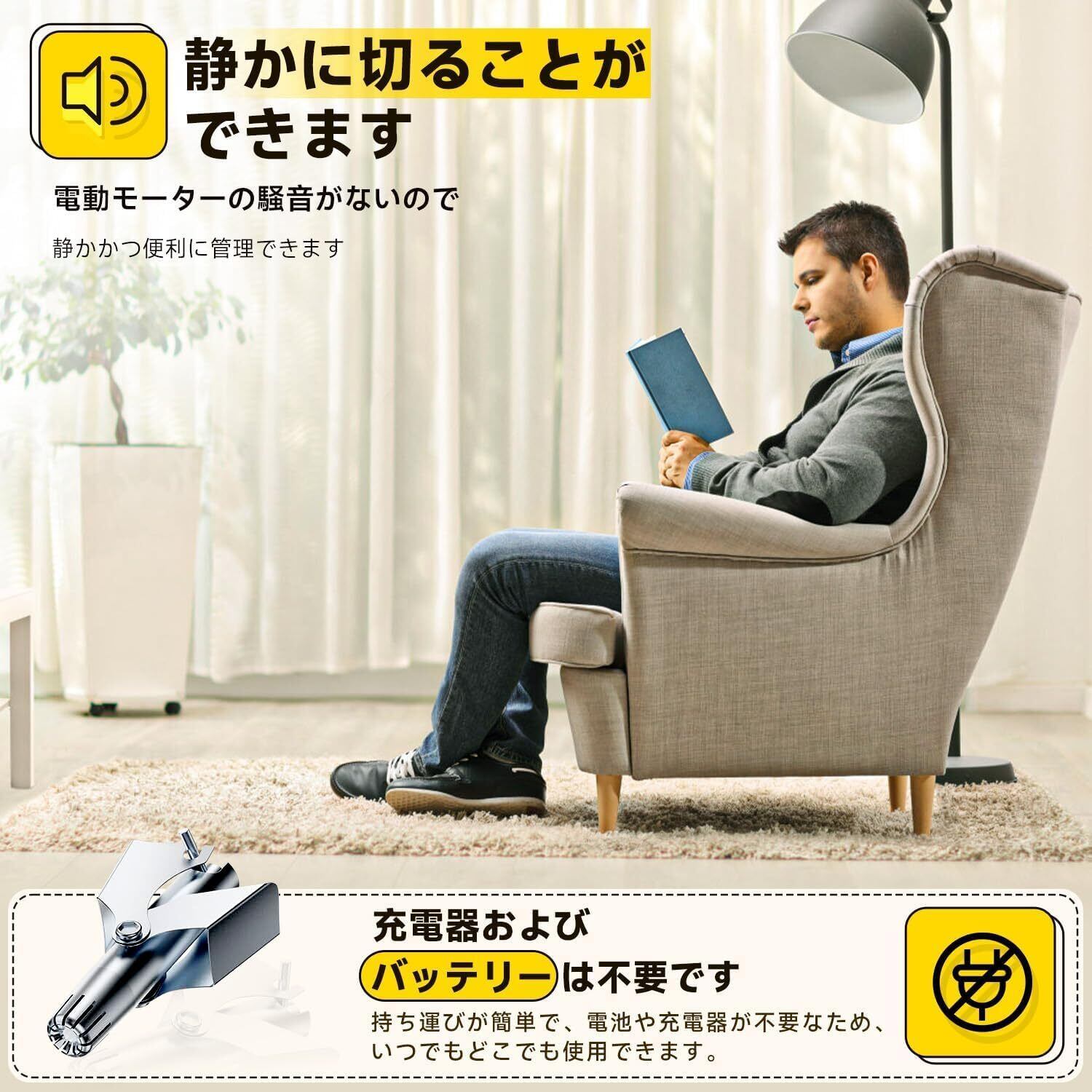 【ポータブル】シンプルなデザイン、コンパクトサイズ、使いやすい。 手のひらに収まる小ささです。 外出先で鼻毛が出ていることに気付いた場合でも、この鼻毛カッターを鼻から取り出し、トイレで鼻毛を切り取ることができます。 電池切れの心配なし