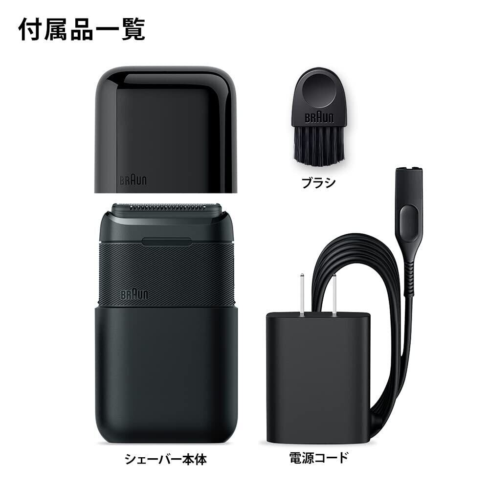 「小さいのに、パワフルな剃り味。」Braun miniは、従来のモバイルシェーバーよりも2倍のカットパワー*を実現。浮き沈みする2枚刃が肌に密着し、小さいのにパワフルな深剃り。*Braun M-90と比較。「2台目シェーバーに。商談前も、夕食前も。」商談や会議、会食やデートといった出先での大事なシーンの前にヒゲをケアして清潔感をキープ。マスクの下で伸びた気になるヒゲも素早くカット。同梱物:電気シェーバー、電源コード、ブラシ 浮き沈みする2枚刃が肌に密着。最高峰モデルの網刃を搭載しヒゲをしっかりキャッチ。S字型トリマー刃で剃り残さない。進化した肌に優しいマイクロコーム。 丸みを帯びた形状のマイクロコームが刃を覆い、より肌に優しい快適な肌触りに。丸ごと水洗い。 お風呂や洗面台、外出先でも簡単メンテナンス。コンパクトなデザイン。 2台目使用を想定した、持ち運びやすいデザイン。バッグなどに入れて、毎日持ち歩こう。パワフルなバッテリー。フル充電で、約40分駆動。また急速充電機能で、5分充電するだけで、一回のシェービングが可能パワフルなモーター 。卓越した技術で、小さいボディに強力なモーターを搭載。手のひらサイズでも、深剃りをより簡単に。優れたデザイン性。コンパクトでスタイリッシュなデザインで世界三大デザイン賞の「iF design award 2021」「Red Dot Award Product design 2021」を共に受賞。ニッケル水素電池はリサイクルへ