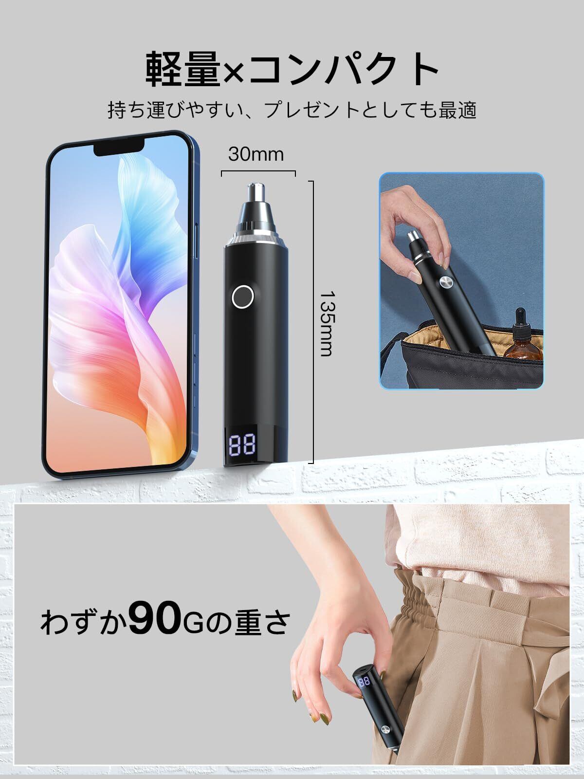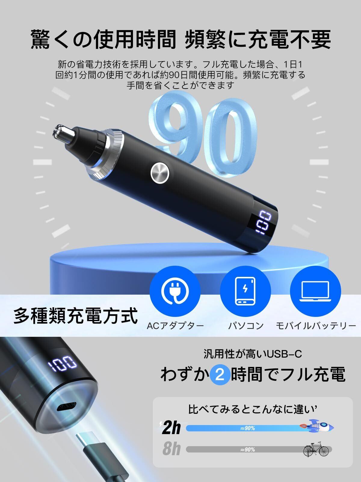 【LCD画面 & Type-C急速充電・驚きの使用時間】デジタルLCDスクリーンを搭載したので、いつでも電力残量を把握することができ、途中で停電する心配がなく、使用体験をアップします。USB充電ポートの独自の設計を使い、過電圧、過充電、短絡を防止し、安全性を向上させる同時に、充電速度を大幅に向上し、満タン充電はわずか2時間です。鼻毛カッター パワフルでありながら消費電力が少なく、1度充電すれば最大3ヶ月間の鼻毛切りが行えるため、出張や旅行の移動用としてバッテリー持ちが良く長時間使えます。
