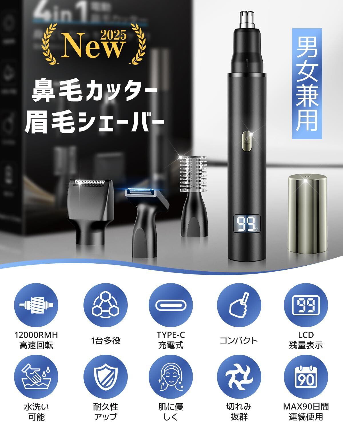 鼻毛カッター メンズ 【2025年新モデル・1台4役】 眉毛シェーバー レディース エチケット 多機能 はな毛カッター USB-C充電式 鼻毛トリマー 肌に優しい 12000回高速回転 長さ調整可能 軽量 コンパクト 水洗い可 1台多役 持ち運び便利 低騒音 電動シェーバー 男性 電動式 電動式カッター エチケットカッター メンズ レディース 男女兼用 掃除用ブラシ付き (ブラック)