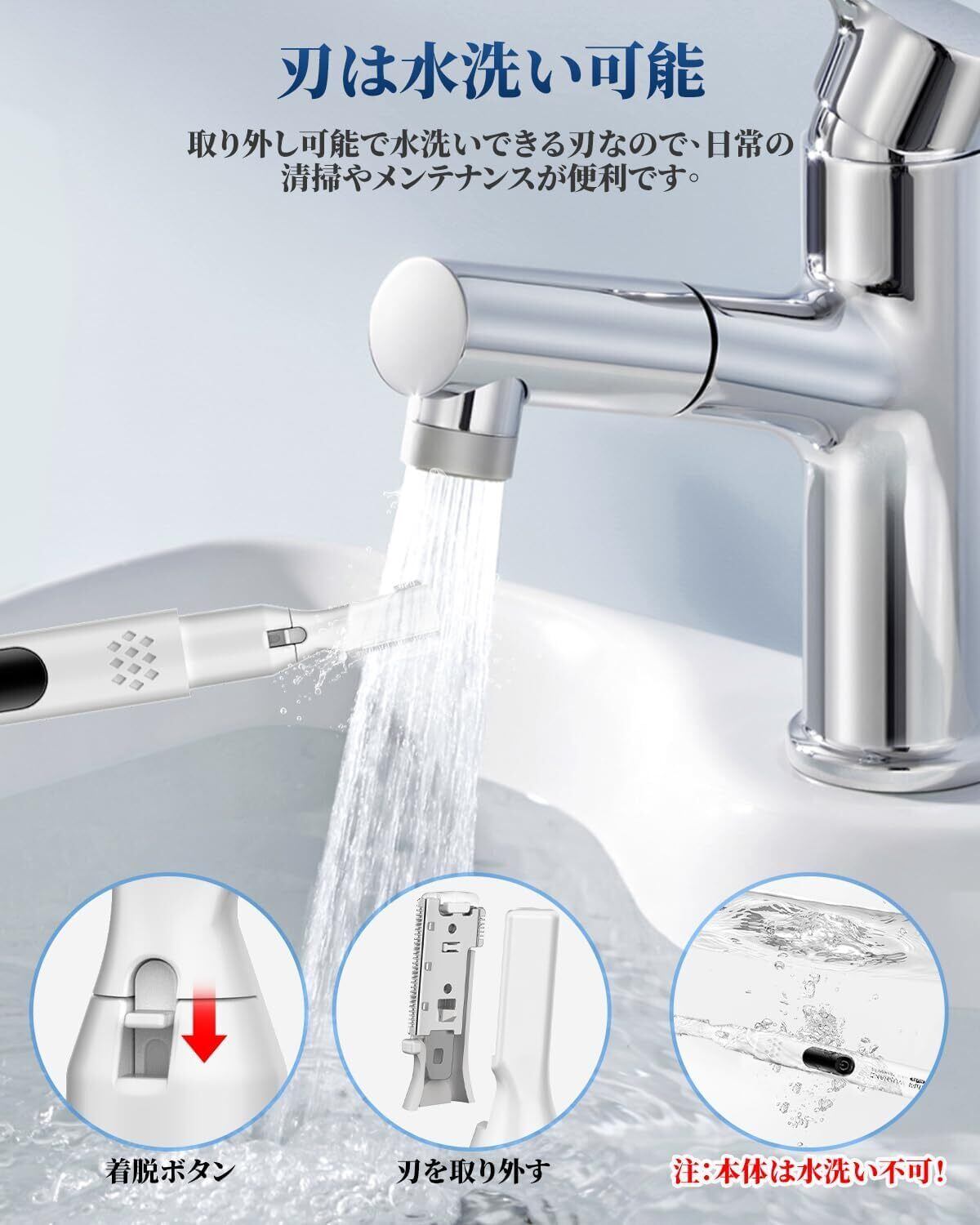 【刃先は水洗い可能&お手入れ簡単】本製品の刃先部分は取り外し可能で、水洗いに対応しています。洗浄後は刃を乾燥させて、使用寿命を延ばしてください。 【注意】本体の底部にはType-C充電ポートがありますので、水洗いの際は水が入らないようにご注意ください! 【アフターサービス】当社では、製品出荷前に厳格な検査を行い、品質を確保しております。品質向上に努めておりますが、稀に不良品が発生する場合がございます。万が一、ご購入いただいた眉毛シェーバーに不具合がございましたら、どうぞお気軽にご連絡ください。迅速に対応させていただきます。連絡方法:「アカウントサービス」→「注文履歴」→「販売元」→「質問する」。