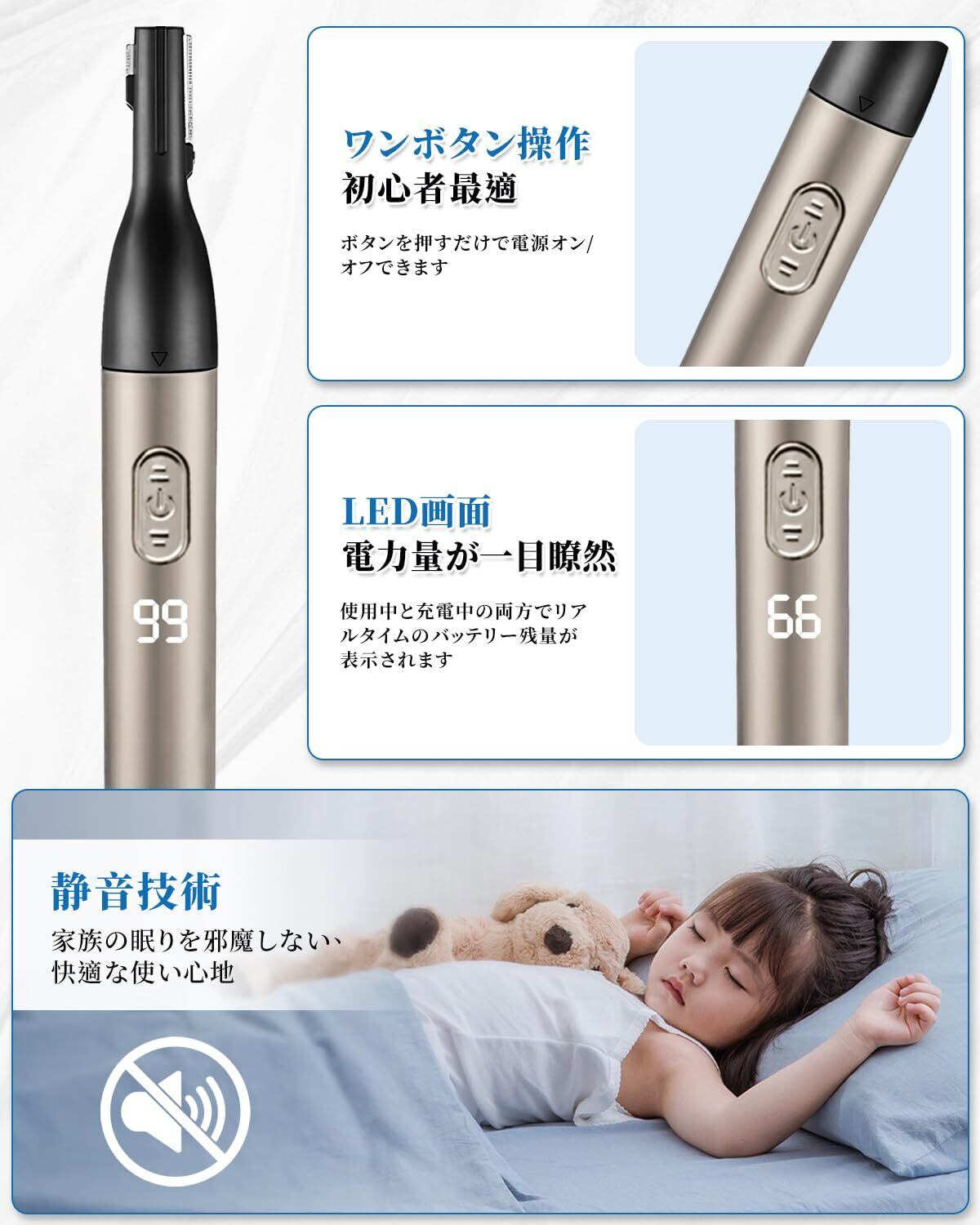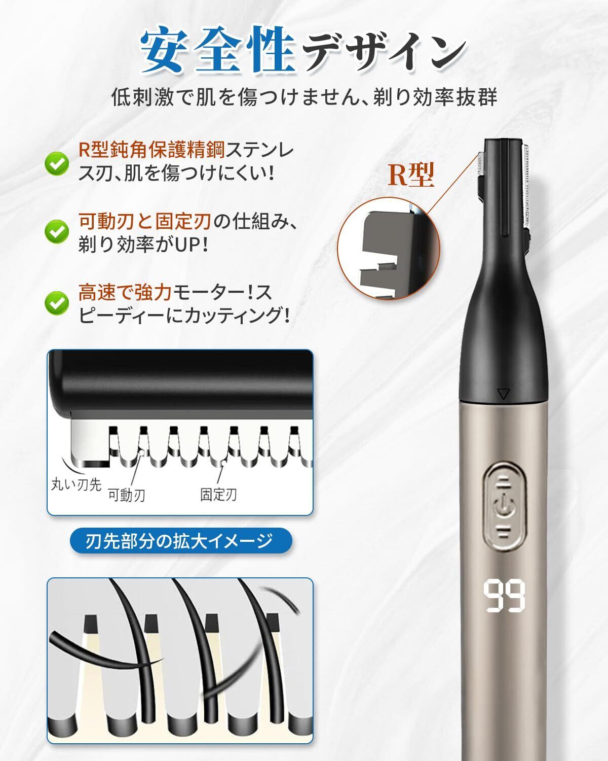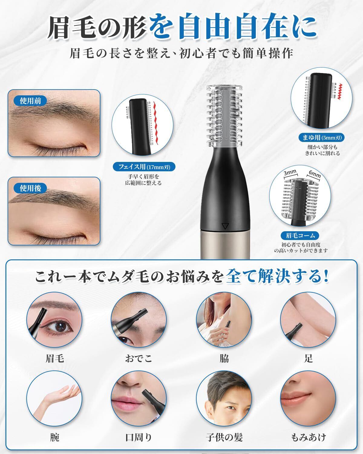 【1台多役眉毛シェーバー&持ち運びやすい】眉毛シェーバーのヘッドを簡単に交換することにより、鼻毛カッター、眉毛シェーバー、耳毛カッターの機能ができます。眉毛だけではなく、頬・鼻毛・髭・腕・足・腋毛・もみあげ・ビキニレイン・赤ちゃんの髪など顔や体のうぶ毛にも使える電動鼻毛 眉毛カッター メンズ。眉毛 鼻毛シェーバーは人間工学に基づいた三次元の弧状デザインで、初心者の方でも簡単に使えます!電動エチケットカッターで全てのニーズに対応します。また、コンパクト(約1.8cm*14.3cm)と約35gの軽量デザインで、収納も簡単で持ち運びにも便利です。急ぎの時や出張や旅行の時に、ポケットに簡単に入れることができます。