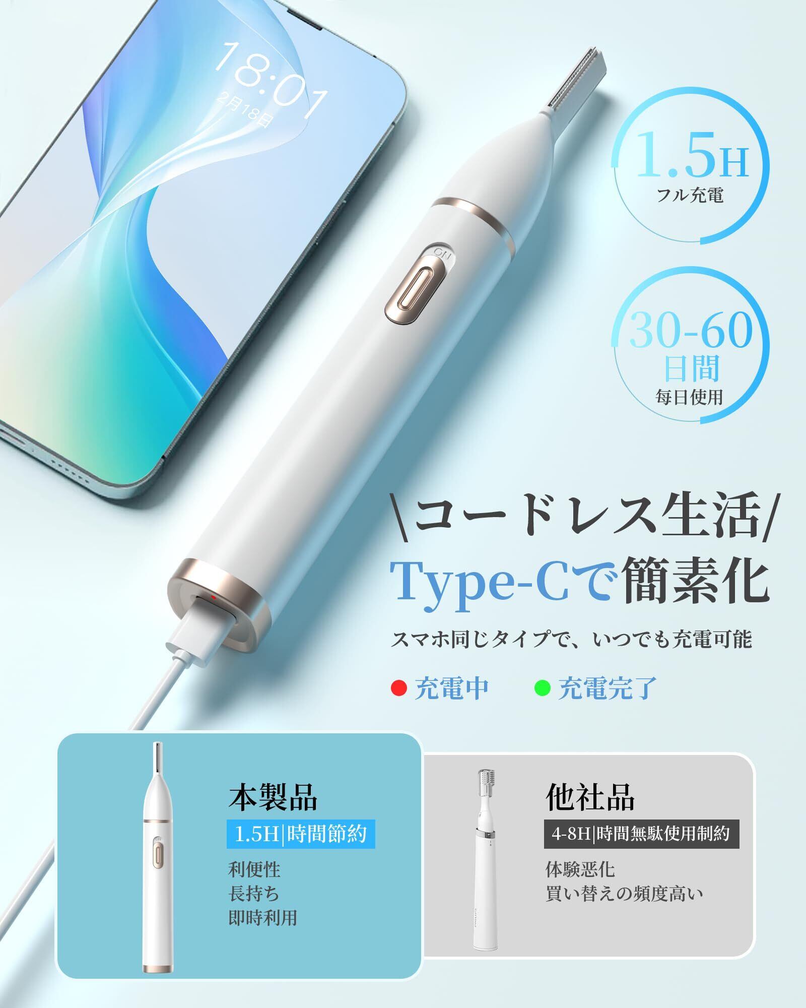 [USB-C充電式、長時間使用可能] わずか1時間の充電で最長60日間使用でき、頻繁な充電の手間を省きます。他社の電池式モデルと比べて、繰り返し充電して使用できるため、経済的で環境にも優しい設計です。旅行や出張中でも充電の心配なく長時間使用でき、移動中でも完璧な眉ケアを維持できます。さらに、パソコンやスマートフォンのバッテリーからも充電可能で、非常に便利です。どこでも充電を気にせず、安心して眉の手入れができます。