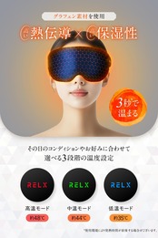 RELX(リラクス)ホットアイマスクは快適な寝心地をお届けする、繰り返し使える高機能アイマスクです。毎日の睡眠用はもちろん、デスクワークや勉強中の休憩、仮眠にも最適です。【3段階の温度調節機能】ボタン1つで簡単操作。48度(高温)、44度(中温)、35度(低温)の3段階で調節可能です。熱伝導率と保温性に優れたグラフェン素材を使用し、電源を入れて約3秒で心地よい温もりを実感。とろんとほどける極上のリラックスタイムに。
