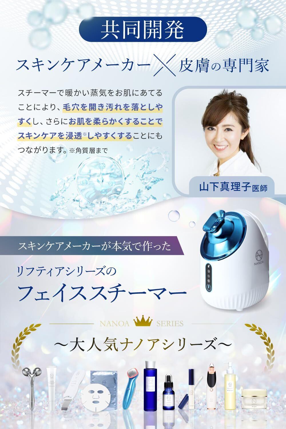 「潤うツヤ肌、上質スキンケア体験を。」NANOAリフティア フェイススチーマーは、乾燥肌、混合肌、ゆらぎ肌が気になる‥そんなあなたのために美容皮膚科医と共同開発したプレミアムフェイススチーマーです。