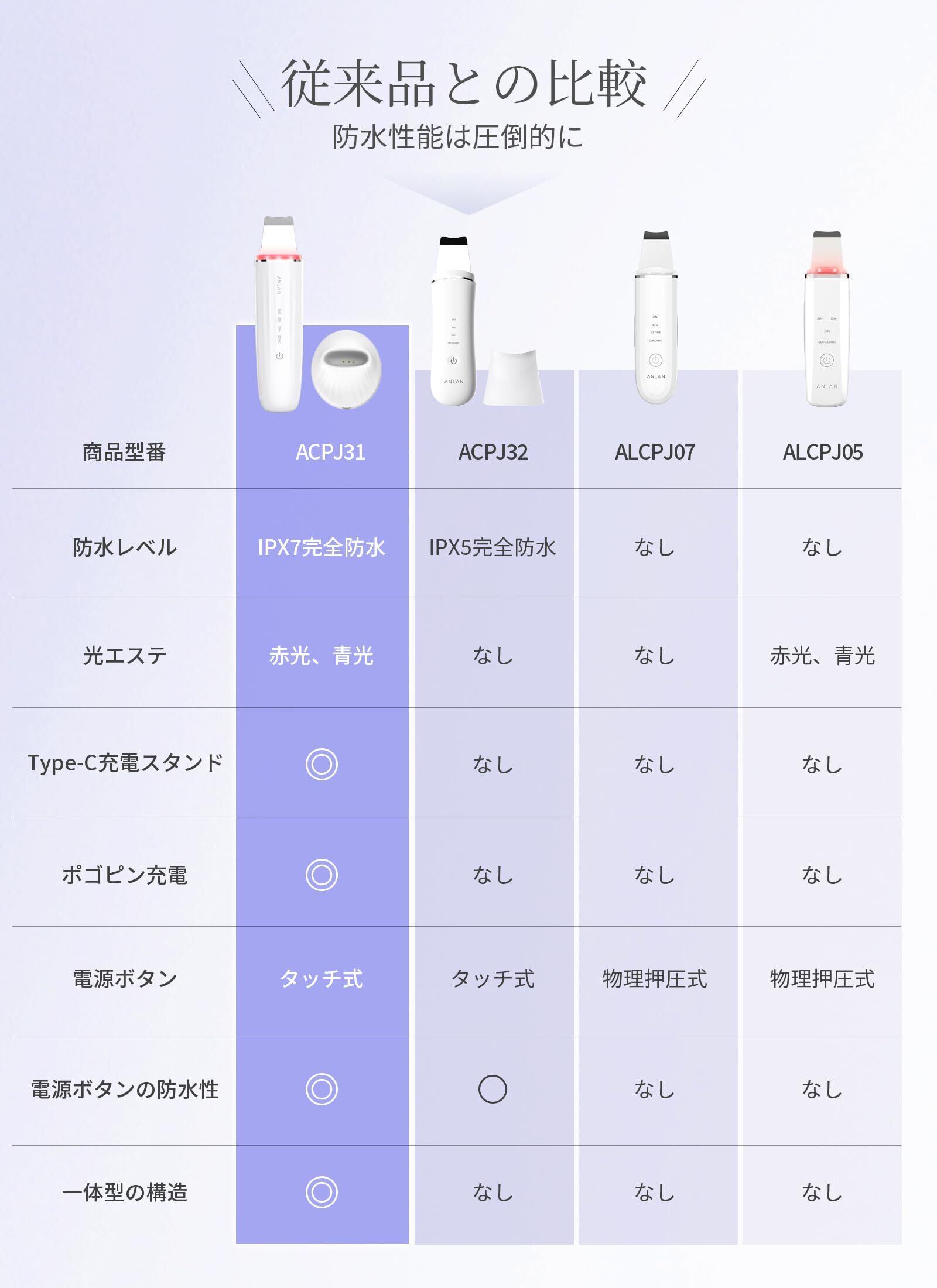 「IPX7完全防水&丸洗い可能」4つのアップグレードでロイヤルウォーターピーリングを完全防水を実現!①業界初!一体型の構造を採用し(市販品は分体式です)、②ポゴピン充電端子(充電口がなく、水の侵入を防ぎます)③タッチ式ボタン(ボダンの周りに隙間がなく)④Type-C充電スタンド付き、本体を置くだけ充電できます。