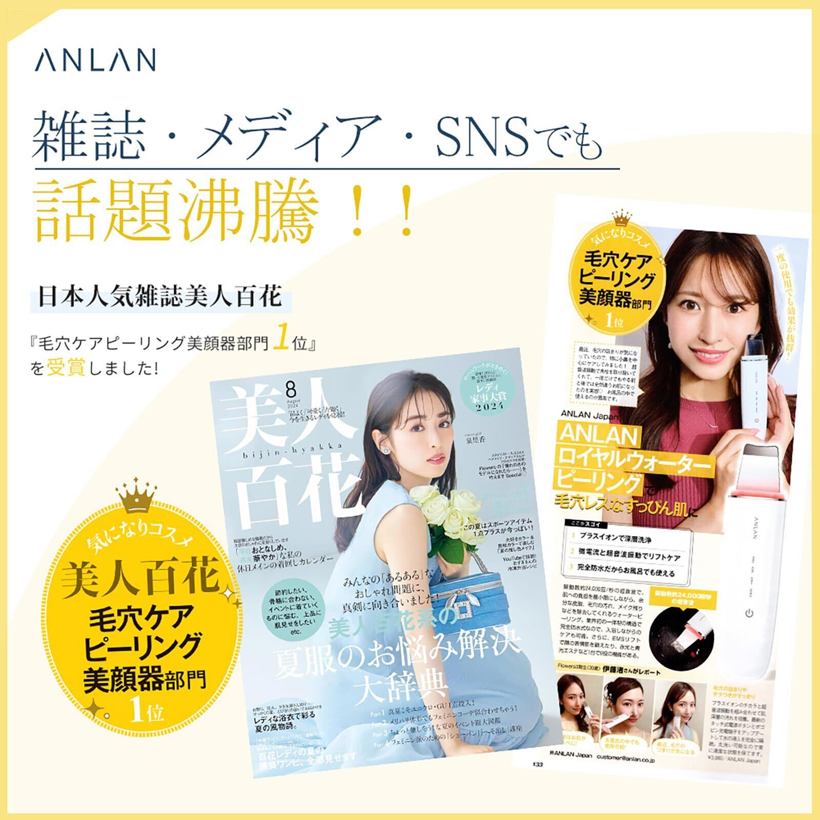 「ANLAN ロイヤルウォーターピーリング、美人百花毛穴ケアピーリング美顔器部門NO1を受賞」ANLAN初めの完全防水式ウォーターピーリング美顔器。業界初!一体型の構造を採用し側面に隙間はない。そして最新のタッチ式電源ボタンとポゴピン充電端子をアップデートして水の侵入を完全に隔絶、IPX7完全防水を実現!水と超音波ですっぴんに自信が持ってる肌へ。