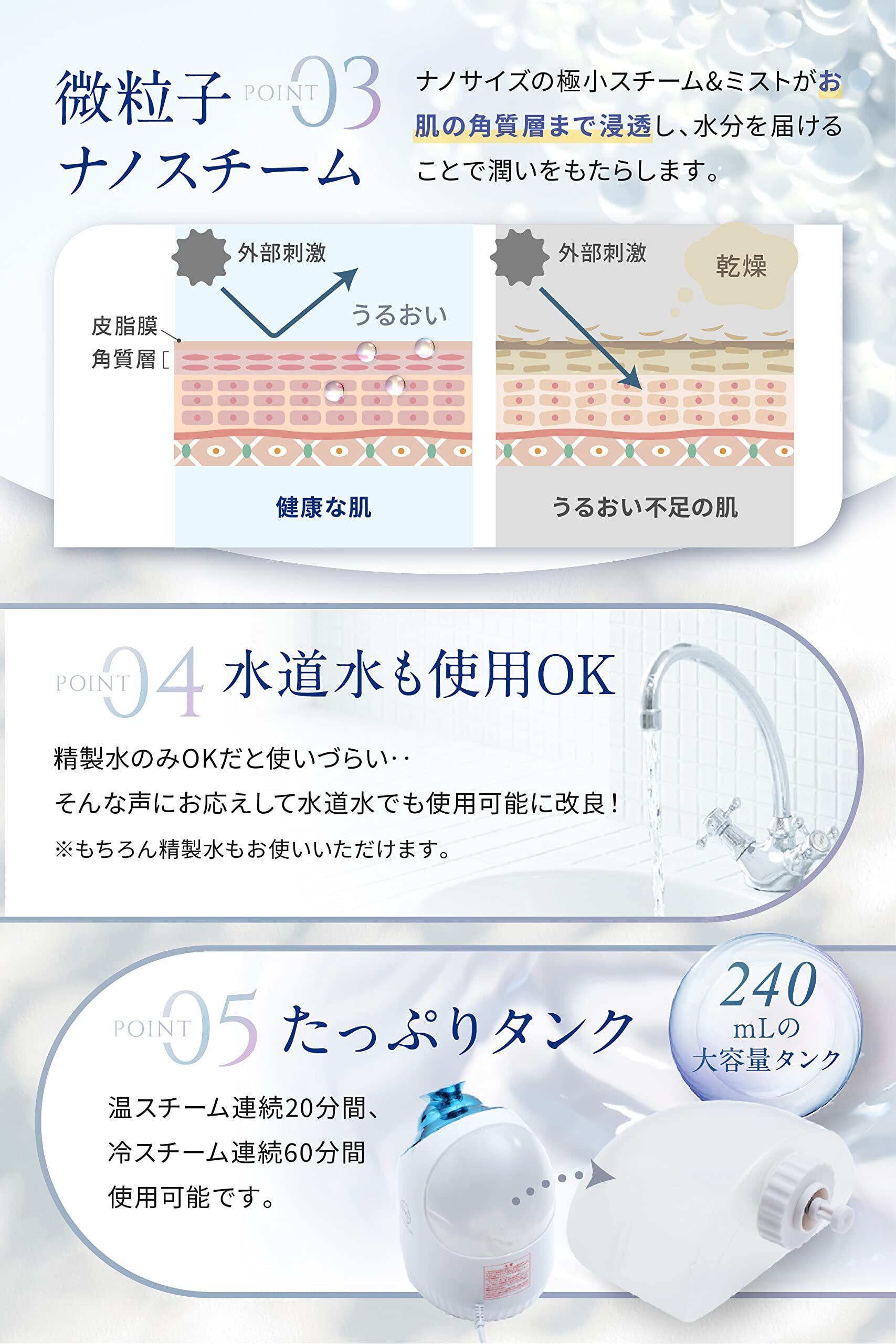 【微粒子ナノスチーム】ナノサイズの極小スチームがお肌の角質層まで浸透し、水分を届けます。【水道水OK】水道水も使用OKなので使いやすい。【たっぷりタンク】240mLの大容量タンクで連続20分間使用可能です。