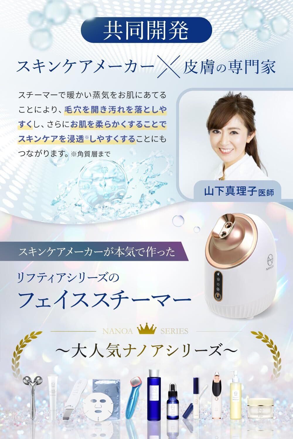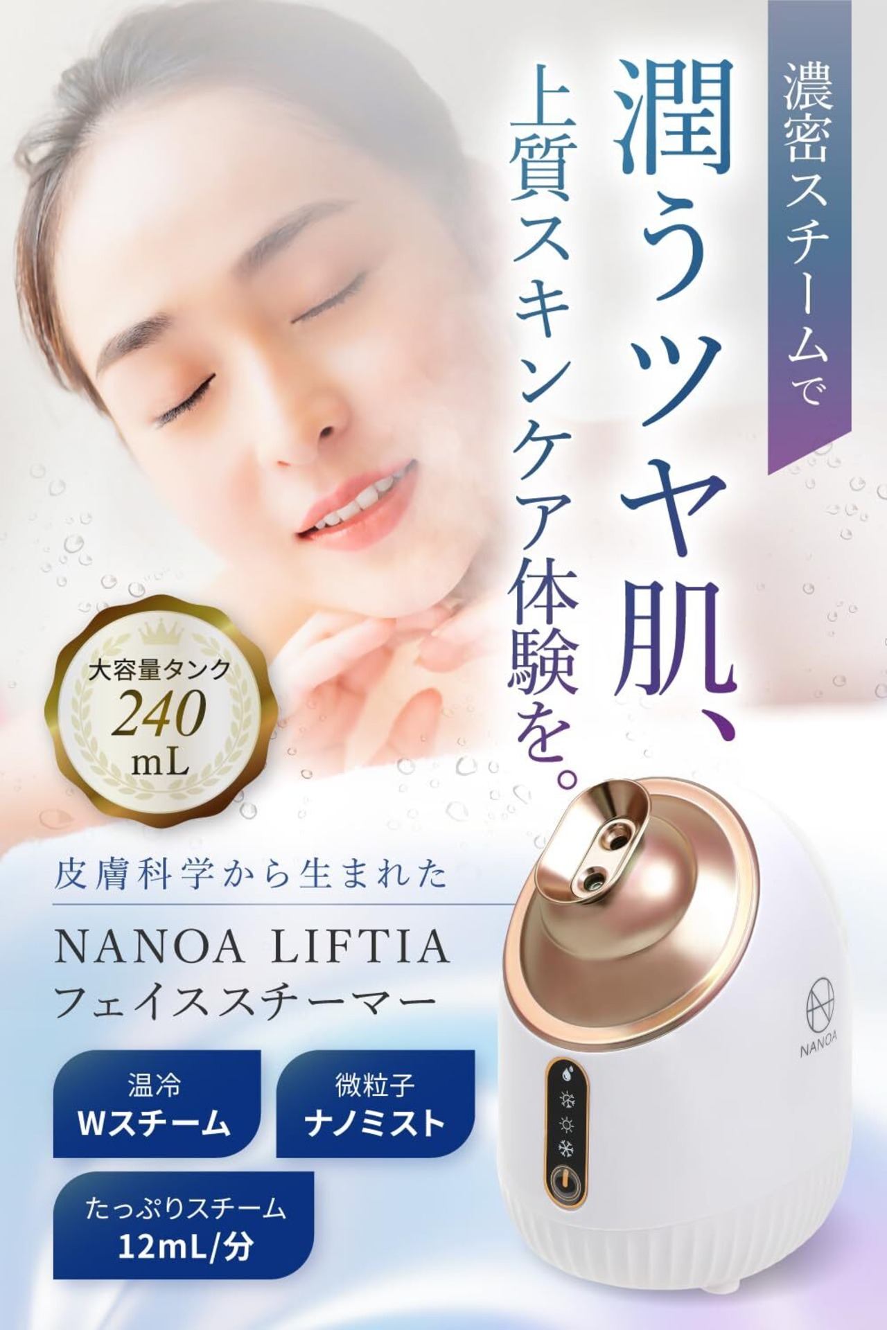 「潤うツヤ肌、上質スキンケア体験を。」NANOAリフティア フェイススチーマーは、乾燥肌、混合肌、ゆらぎ肌が気になる‥そんなあなたのために美容皮膚科医と共同開発したプレミアムフェイススチーマーです。色:ローズゴールド