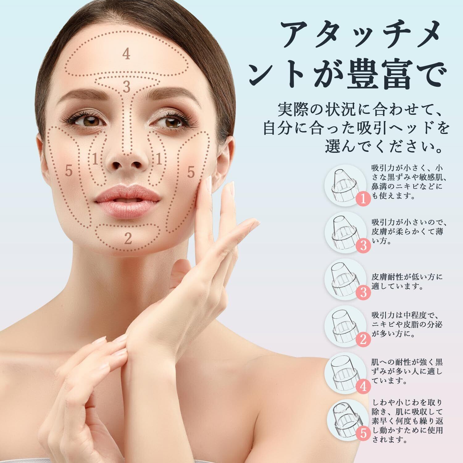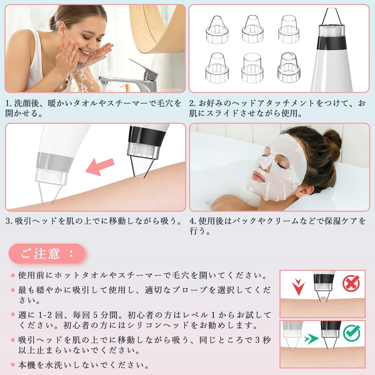 【使用方法&清掃方法】①洗顔後、暖かいタオルやスチーマーで毛穴を開かせる。②お好みのヘッドアタッチメントをつけて、お肌にスライドさせながら使用。③使用後はパックやクリームなどで保湿ケアを行う。「使用頻度」使用によるトラブルを防ぐため使用頻度は週に1回、毎回5分以内を目安に肌の様子をみてご使用ください。また、一か所に3秒以上当てないようにしてください。毛穴吸引器の洗浄方法:①棉棒を使用して、吸引ヘッドの内部の汚れや黒ずみなどを取り除きます。②水で吸引ヘッドを洗浄し、再び棉棒で拭き取ります。③洗浄が完了したら、自然乾燥させてください。