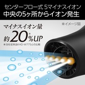 センターフロー式5マイナスイオン機能で、より多くのマイナスイオンを髪に届けます。