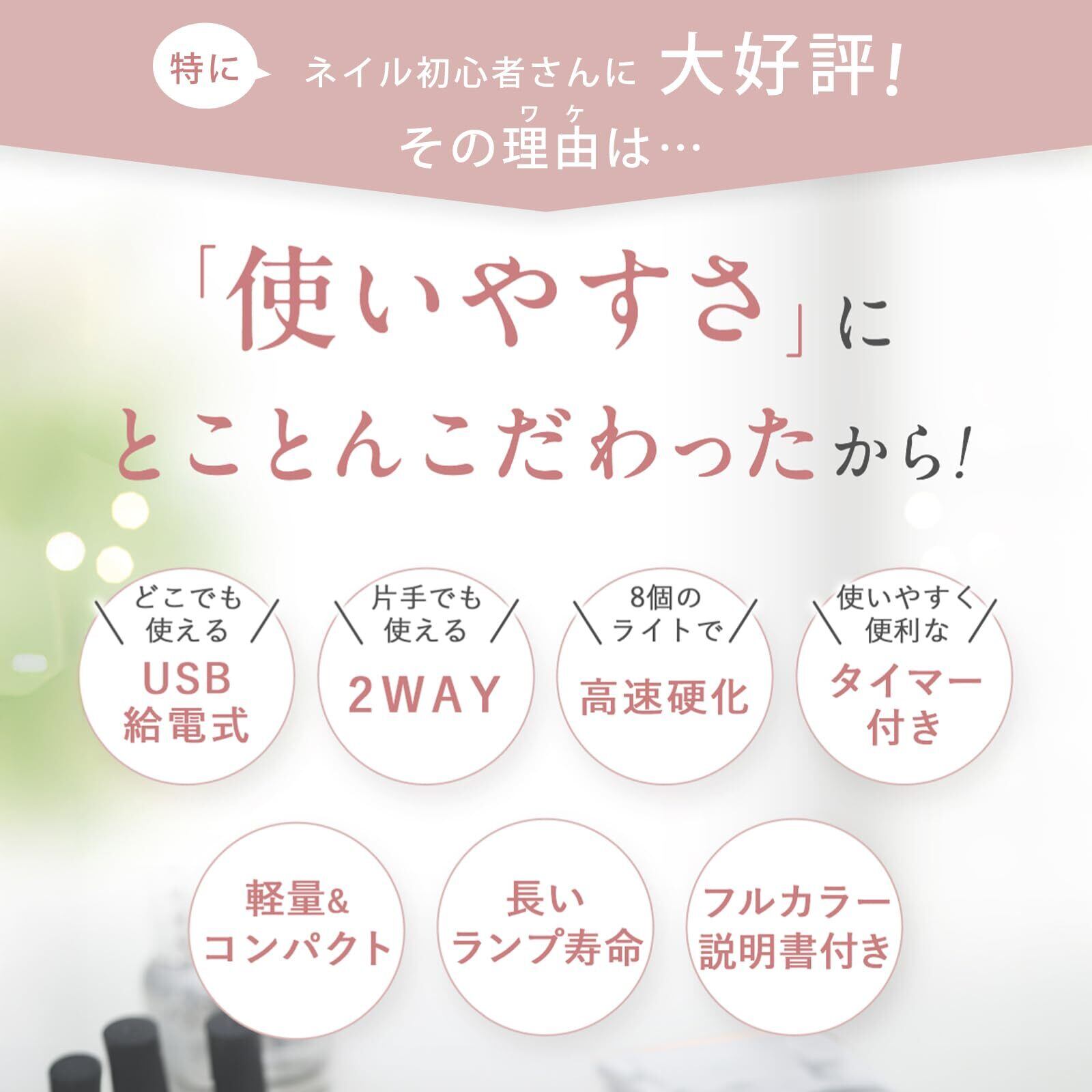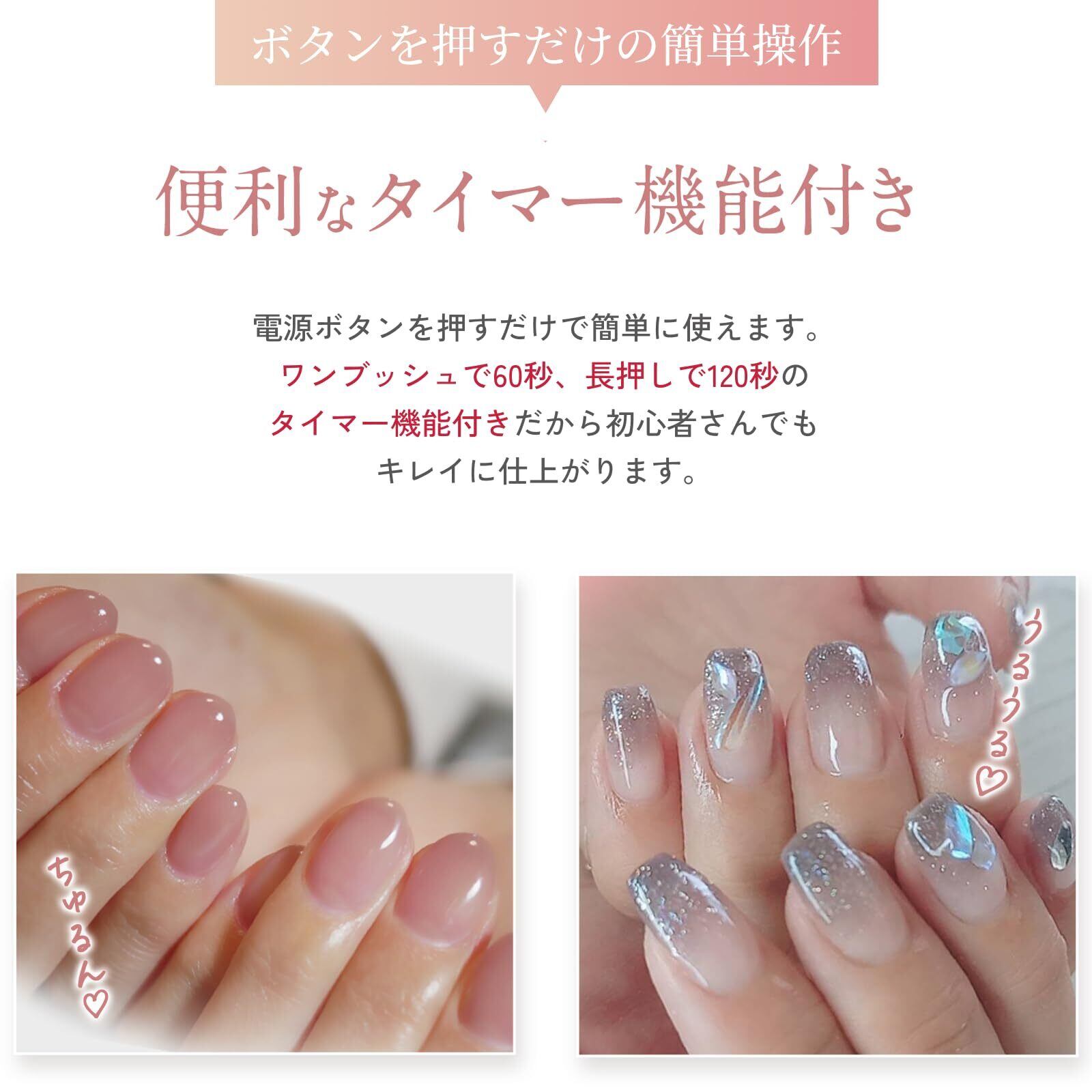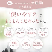 【簡単ワンボタン操作&タイマー機能付き】 電源ボタンを押すだけのワンタッチ操作で、初心者の方でもすぐに使えます!ボタンを1回押せば60秒、長押しすれば120秒のタイマー機能で、ジェルの種類や作業内容に合わせて選べます。、難しい設定なしのシンプル設計なので、手軽に美しい仕上がりのネイルアートを!