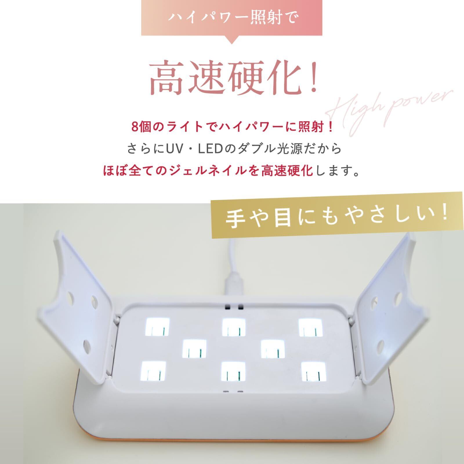 【ハイパワー照射で高速硬化】 8つのパワフルなUV/LEDライトの照射でジェルネイルをスピーディーに硬化!UV/LEDのダブル光源で、さまざまなタイプのジェルネイルに使用可能!硬化時間が短縮できて、ネイルも長持ちしやすくより美しい仕上がりに。時短しながらプロのような仕上がりを目指したい方におすすめ!