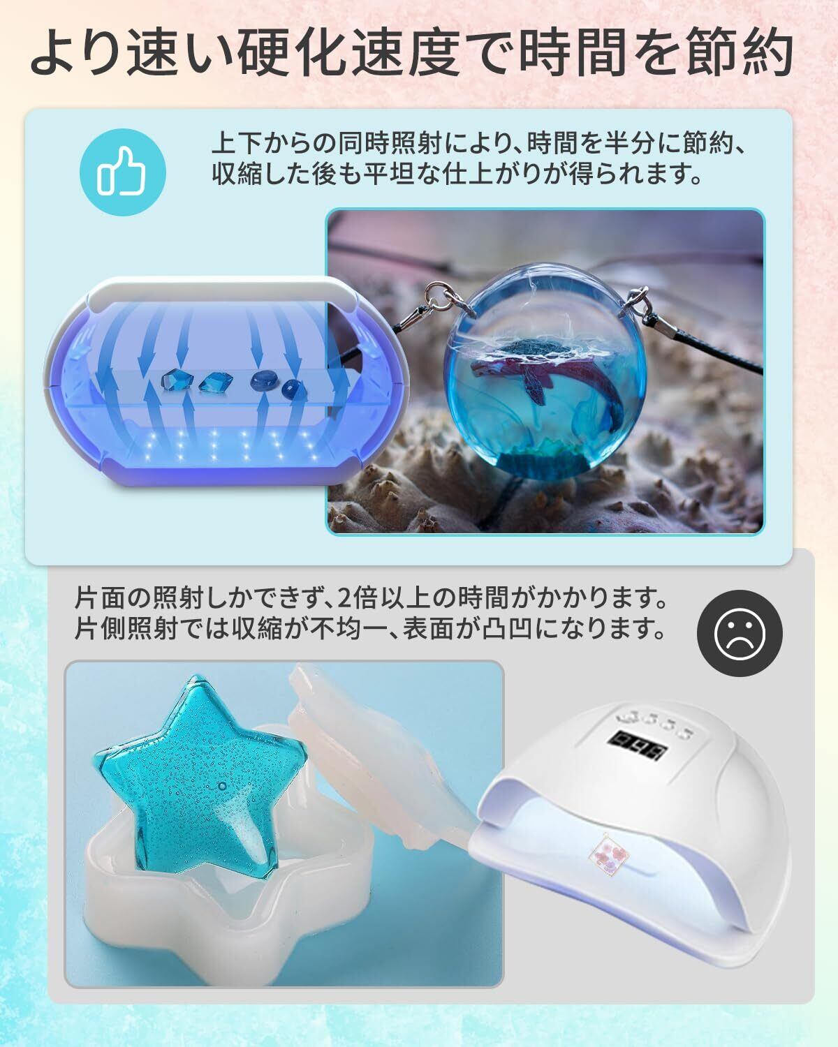 【両面照射と360度光源】360度に配置された48個のLEDが、全方向から均一に光を照射。両面照射機能により、どの角度からでも確実に硬化し、UVレジンの収縮を最小限に抑え、時間と労力を節約します。大型作品や複雑な形状のクラフトにも最適です。