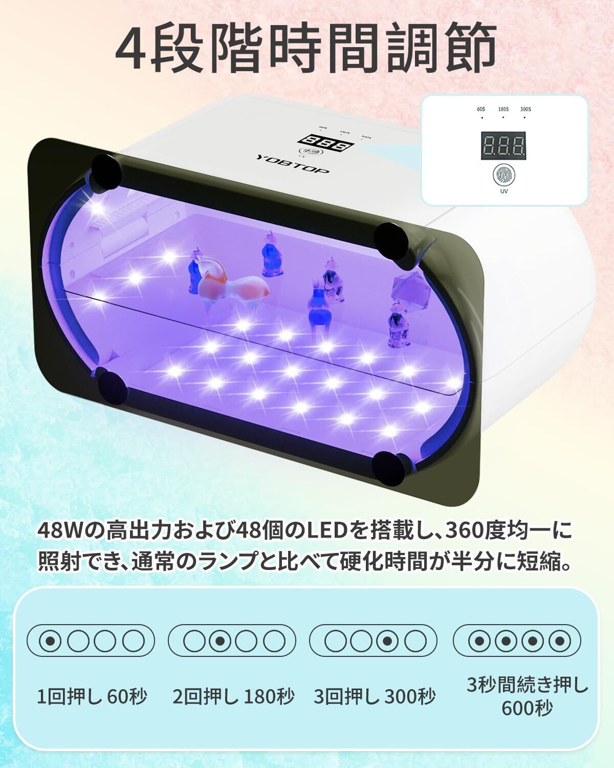 【カスタマイズ可能な長時間タイマー設定】タイマーの設定範囲は4種類あり、60秒、180秒、300秒はプッシュボタンで選択でき、600秒はボタンを3秒間長押しする必要があります。 DIYやジュエリー作りなど、さまざまなプロジェクトに最適な硬化時間を簡単に設定できます。また、デジタル表示で残り時間が一目で確認できます。