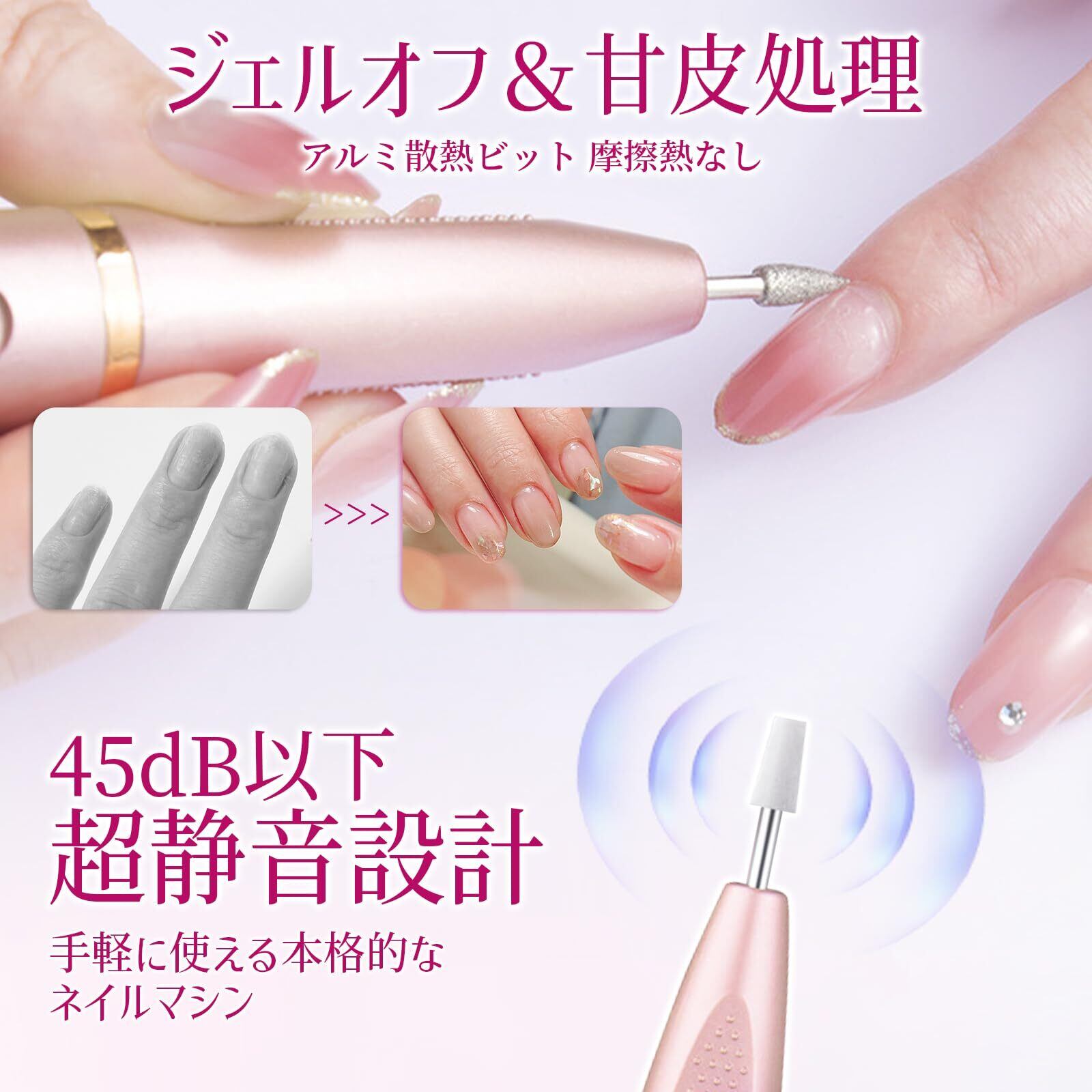 【人間工学に基づいた設計!騒音も放熱もなし!】人間工学に基づいた細めのフォルムで握りやすく、削りたい箇所にしっかりとフィットします。本体も軽量で長時間使用してもで腕が疲れない。アルミ合金製ビットが切り味抜群、ムラなく均一に削れます。不気味な振動、機械音や摩擦熱を一切感じないので、手軽に使える本格的なネイルマシンです。