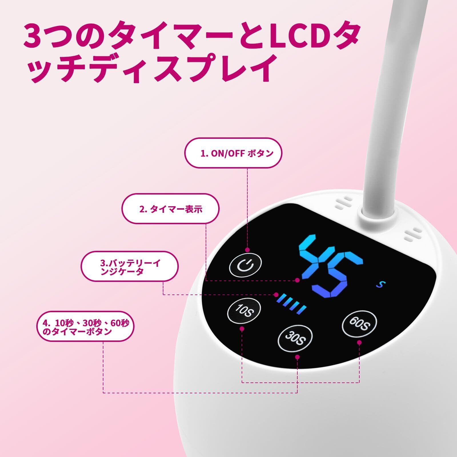 3段階タイマー&LCD表示: UVジェルネイルライトスマートセンサー搭載、自爪を感知して5cm以内。ミニUVネイルライトには、3つのタイマー設定 (10秒/30秒/60秒) が付いています。また、内蔵されたLCD画面にはUVライトの残り時間が表示されます。ボタンをクリックするだけで、さまざまなニーズに合わせて自由に切り替えることができます。(補足:LEDスクリーンには保護フィルムが貼ってありますので、剥がしてお使いください)