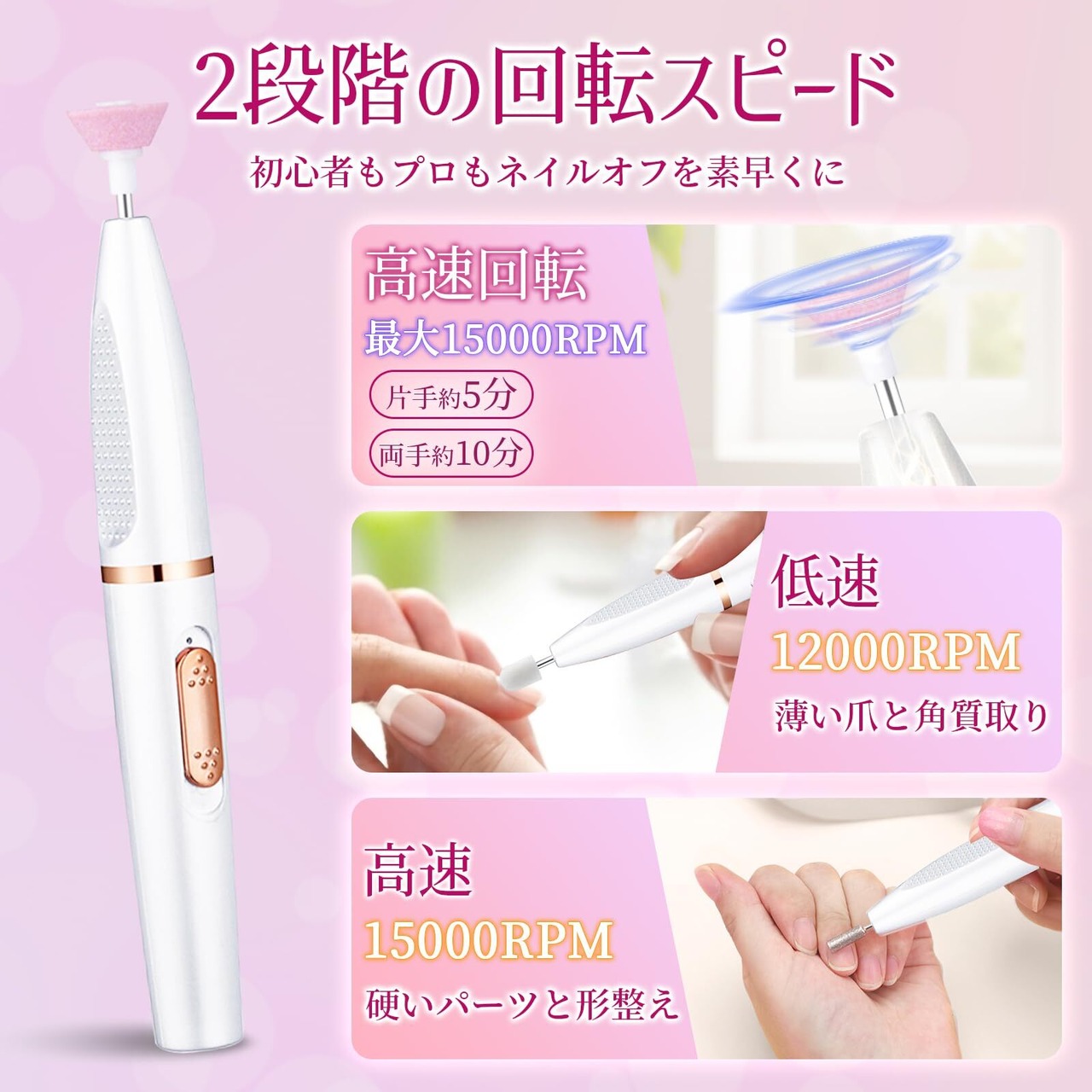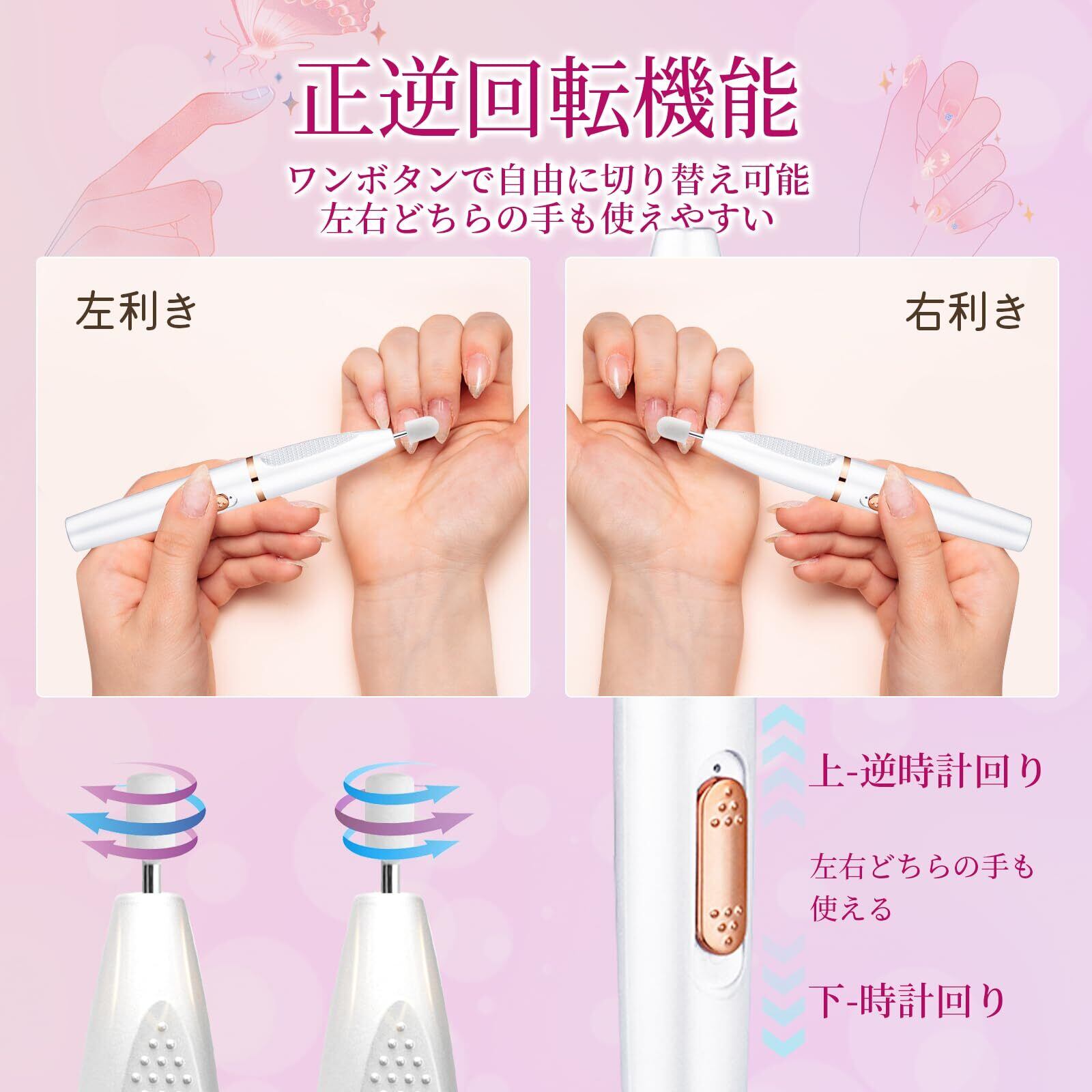 【最大15000 RPMまで!回転速二段階調節!】ネイルマシンの回転速が0-15000 RPMの範囲で調整でき、最低速度でも甘皮処理が可能なため、初心者でもケガをする恐れなく使用でるネイルマシンです。用途や利き手に応じて正逆転換を自在調節でき、左手右手の両方のネイルオフにぴったりです。※初心者は回転数を徐々に上げていく方がお勧めです。