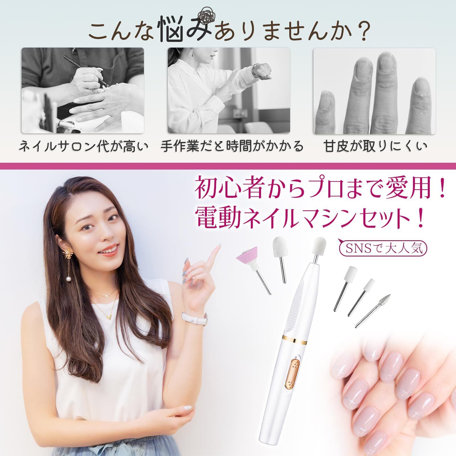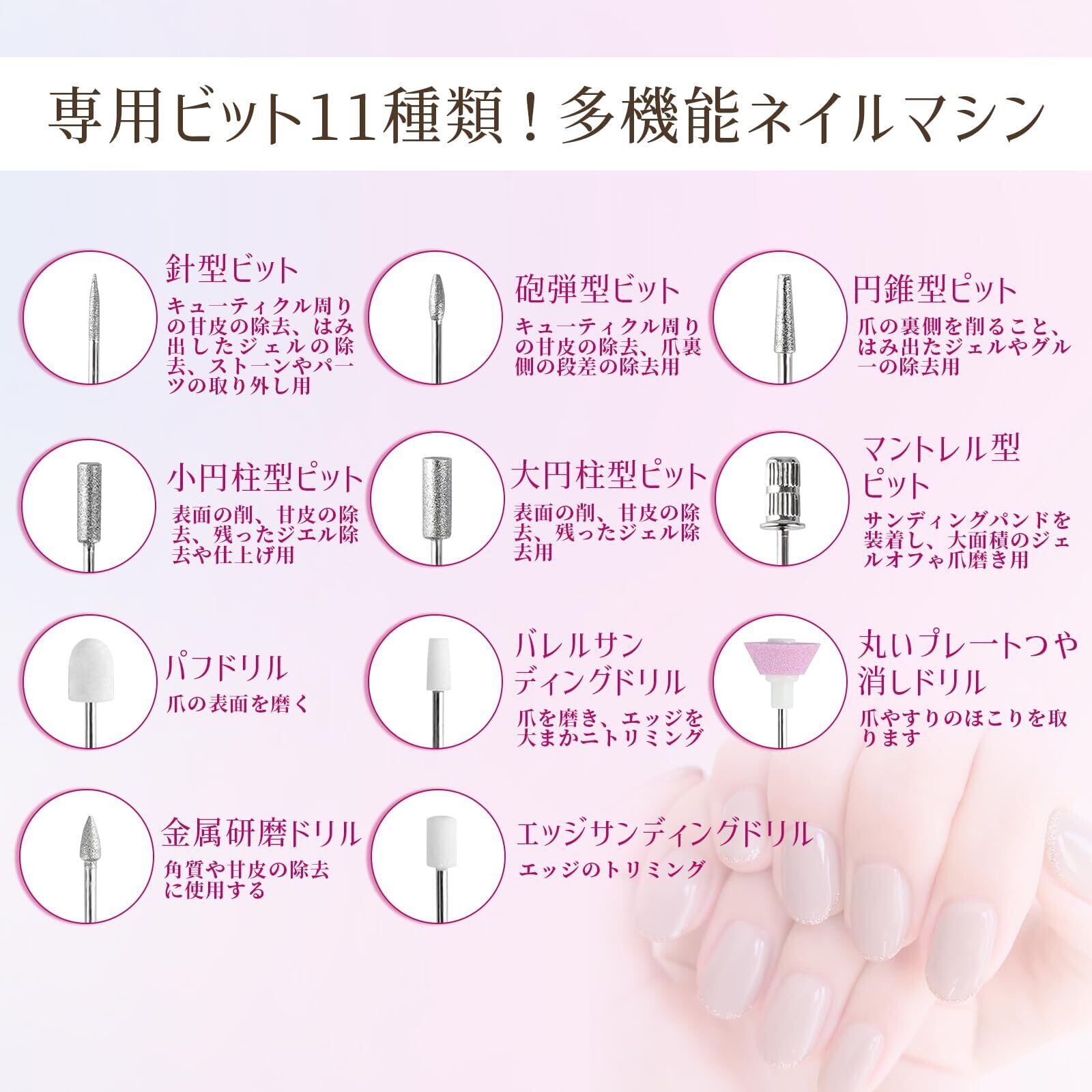 【専用ビット11種類!多機能ネイルマシン!】多機能ネイルマシンは専用11個ビットとサンディングバンド26個を付属し、爪の下準備、カット、ジェルオフ、甘皮処理、長さ/厚み/先端の形整え、つや出しなど、これ一つですべて対応できます。日本語説明書付き、ビットを付け替えもスムーズに、自宅で手軽くにネイルチェンジを楽しめます。