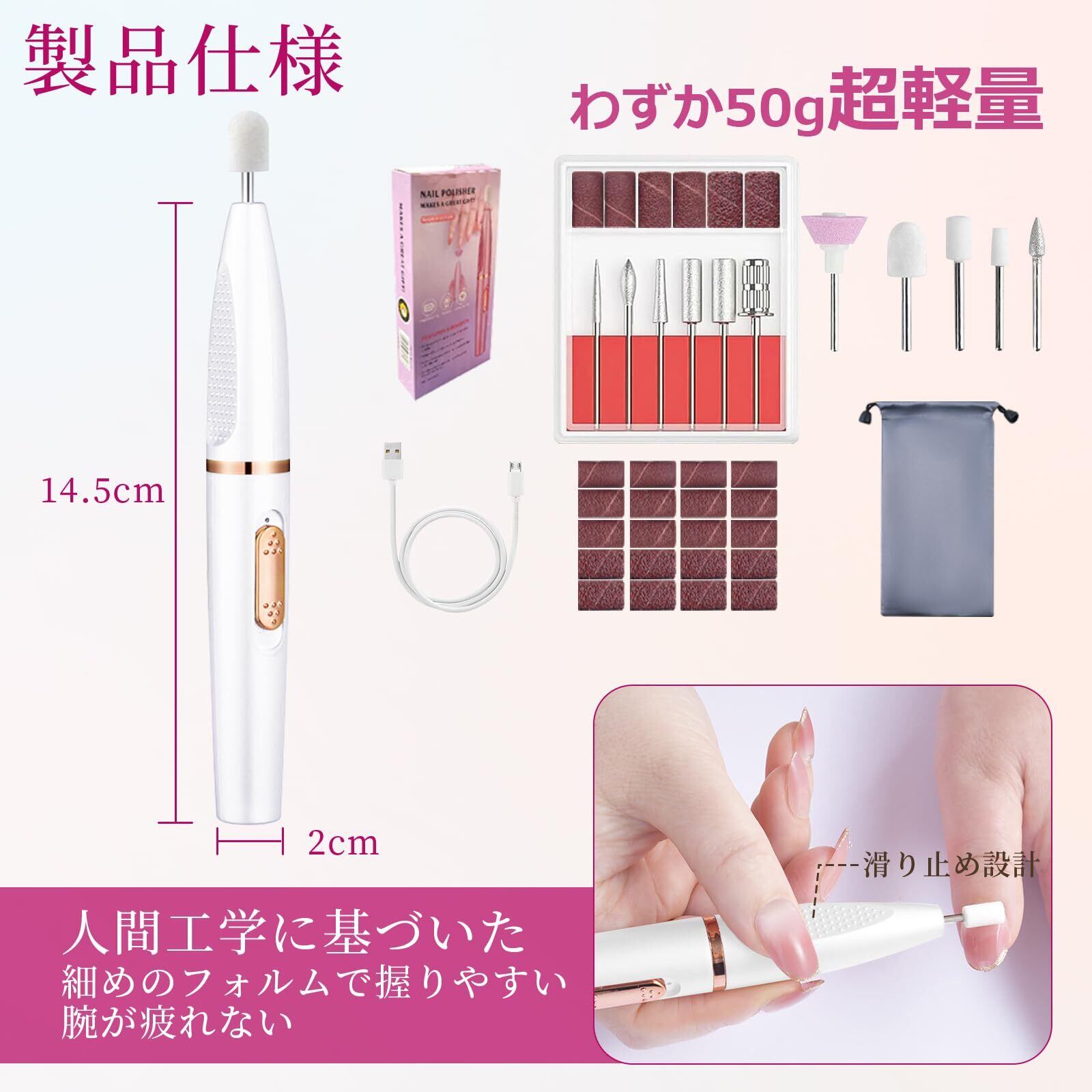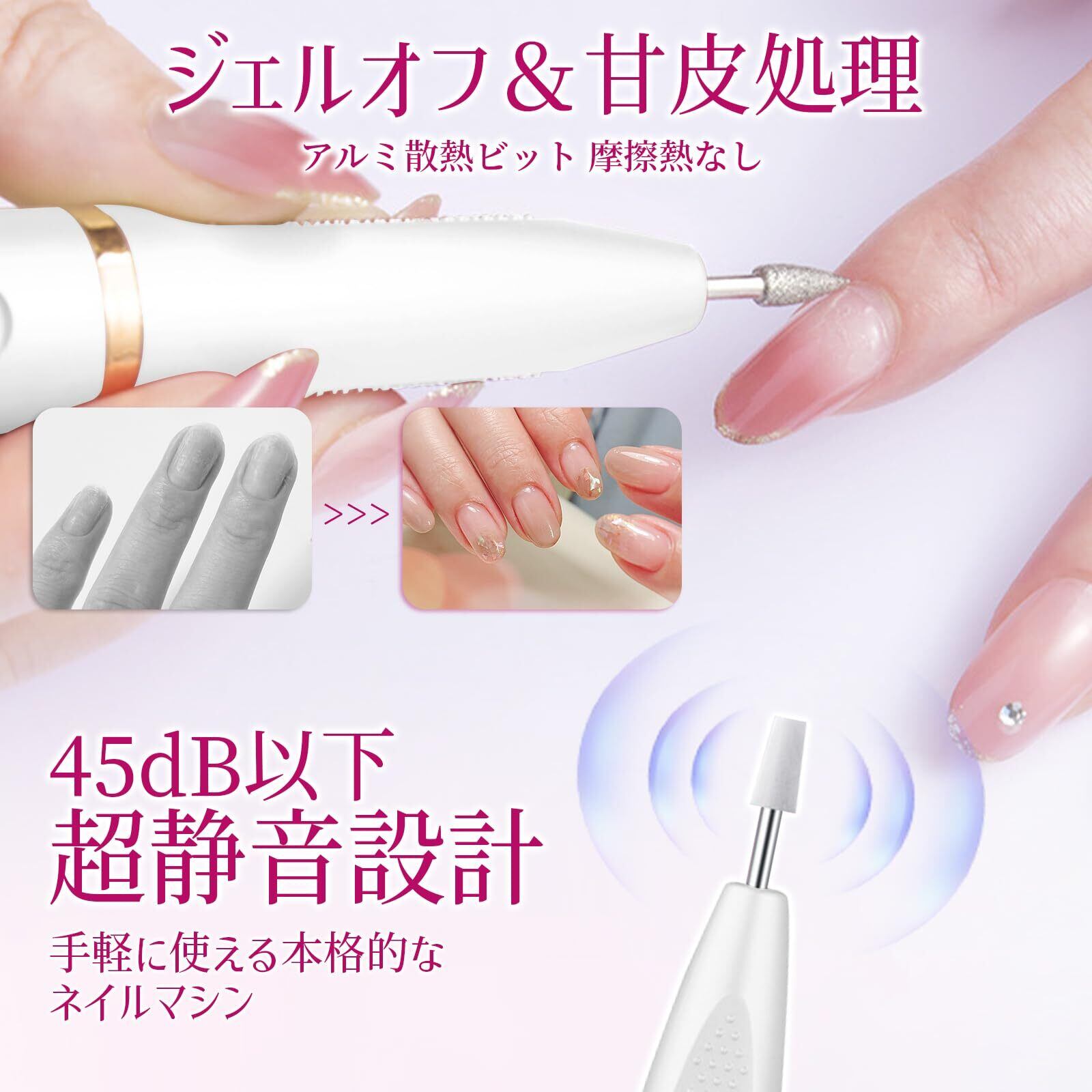 【人間工学に基づいた設計!騒音も放熱もなし!】人間工学に基づいた細めのフォルムで握りやすく、削りたい箇所にしっかりとフィットします。本体も軽量で長時間使用してもで腕が疲れない。アルミ合金製ビットが切り味抜群、ムラなく均一に削れます。不気味な振動、機械音や摩擦熱を一切感じないので、手軽に使える本格的なネイルマシンです。