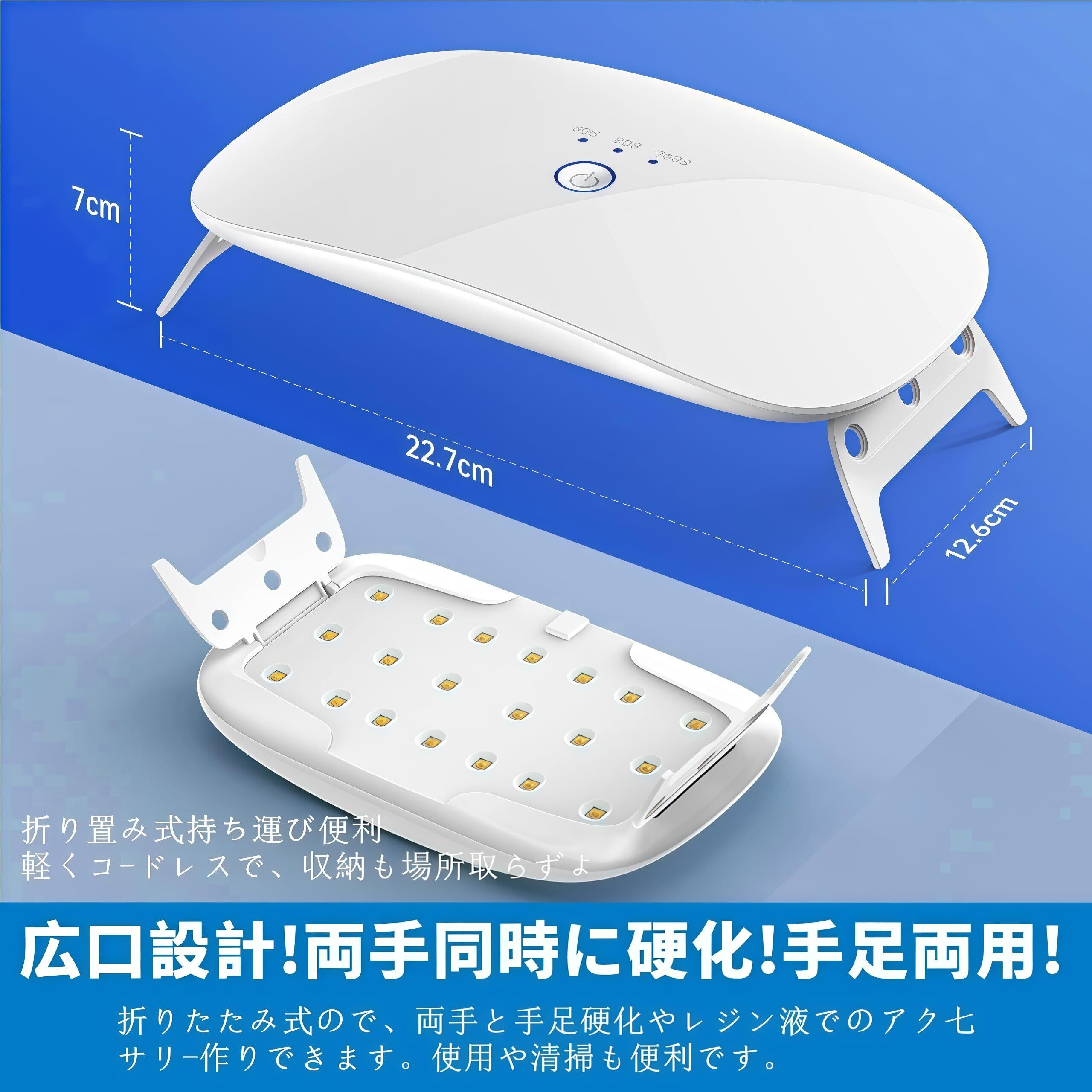 【2025最新UV+LED二重光源】30w ledネイルライトは、最新のUVとLED二重光源をを採用しています。波長は365+405nmと幅広い範囲なので、あらゆるジェルやレジンクラフトにご使用頂けます。仮硬化、大型パーツの一時固定、UVレジン、UV硬化樹脂、UV接着剤、ジェルネイル用ジェル等幅広くご使用していただけます。
