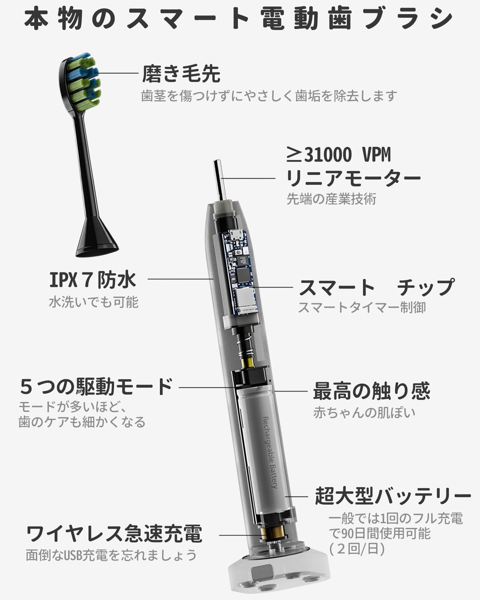 【強力な音波洗浄と1年】最新型の電動歯ブラシである。歯肉線に沿って音波振動技術で効果的に洗浄し、99%以上の歯垢を除去し、歯を白くなります。手磨きよりも2週間で口腔健康の状況がアップされます。[ 一年 ] 万が一、取扱説明書に従った使用で不具合があった場合には、いつでもご連絡ください。弊店はご満足なカスタマー サービスを提供いたします。