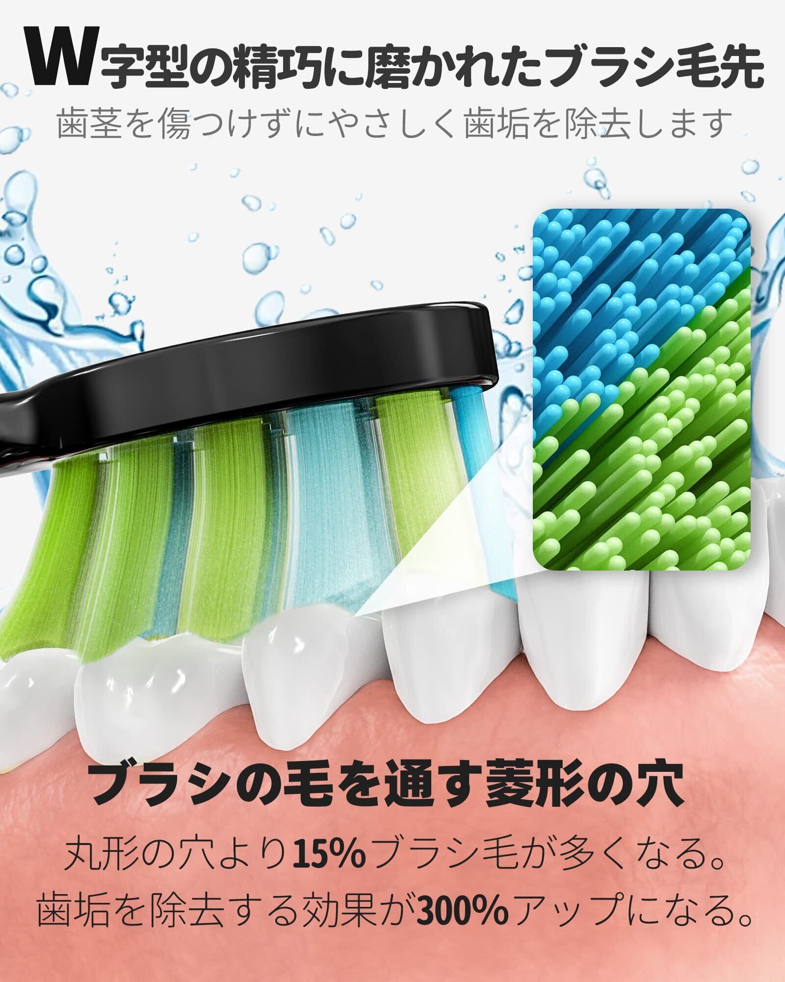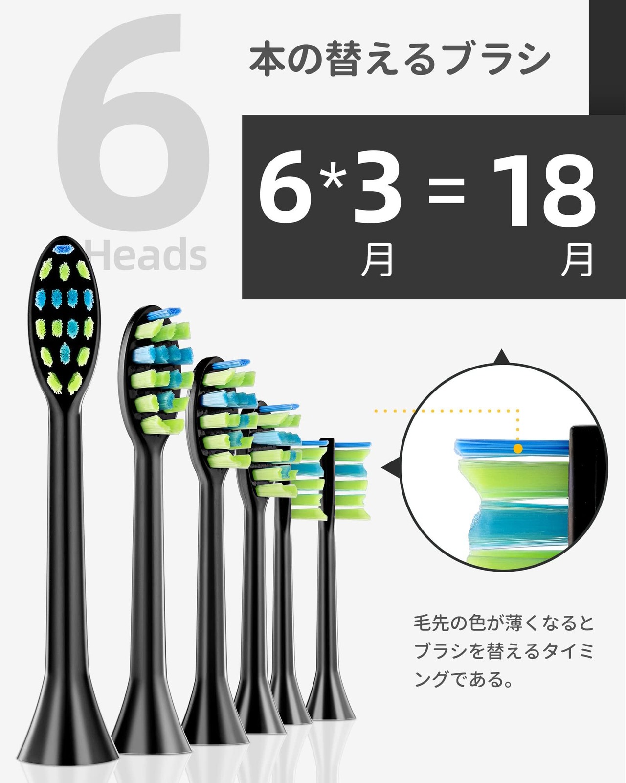 【6つの替えブラシ、「W」デザイン】替えるブラシヘッドを6個付属しているので、頻繁に交換用の電動はぶらしヘッドを注文する必要がありません。 毛先にはDUPONTナイロンを採用し、歯の形に合わせた「W」デザインで、歯ぐきや届きにくい部分を徹底的にクリーニングします。 注意:口腔内をやさしく扱っていただきます。 青いブラシ毛先の色が薄くなったら、ブラシヘッドを交換してください。 1つのブラシヘッドで3ヶ月間使用できて、6つのは約18ヶ月間使用できます。