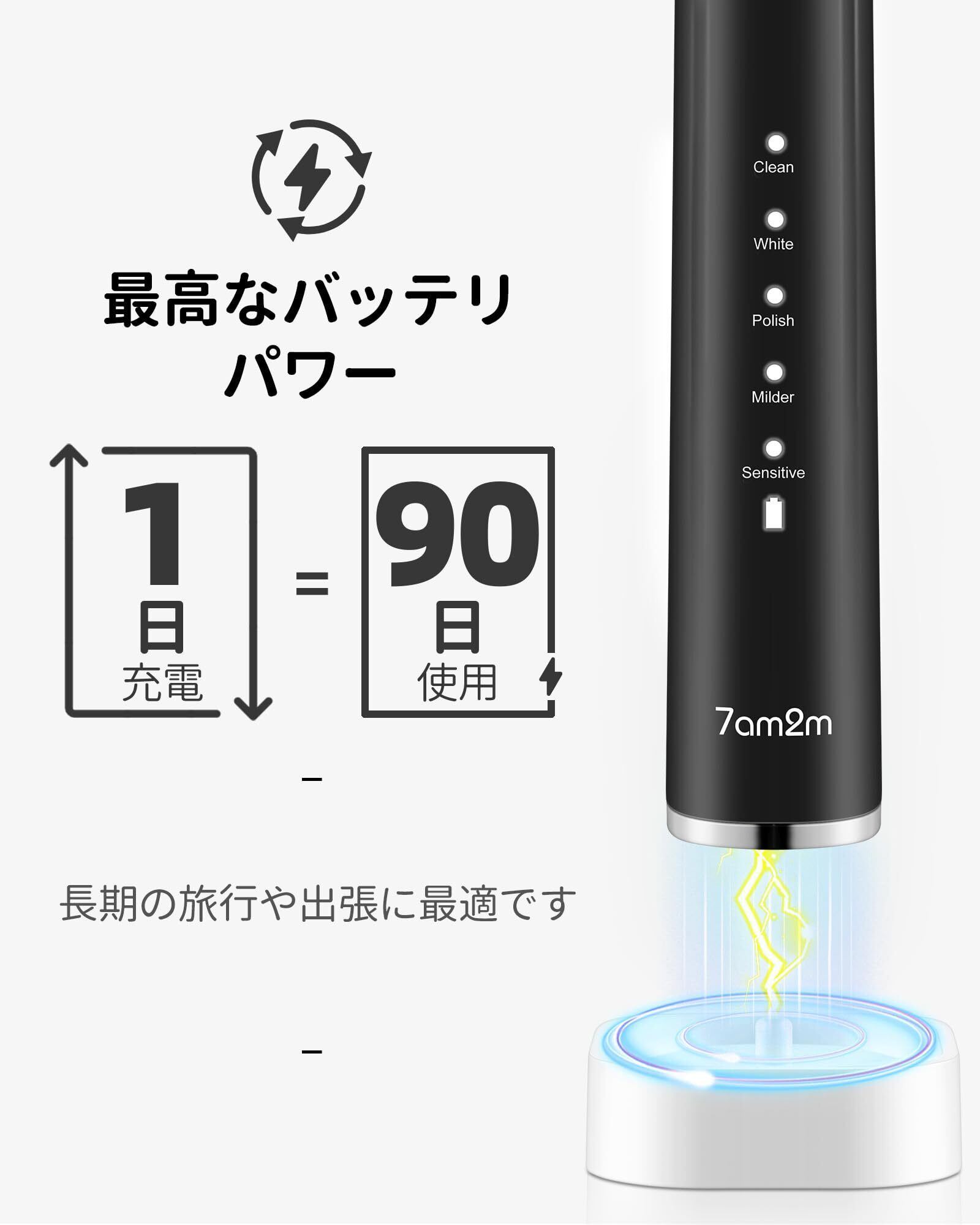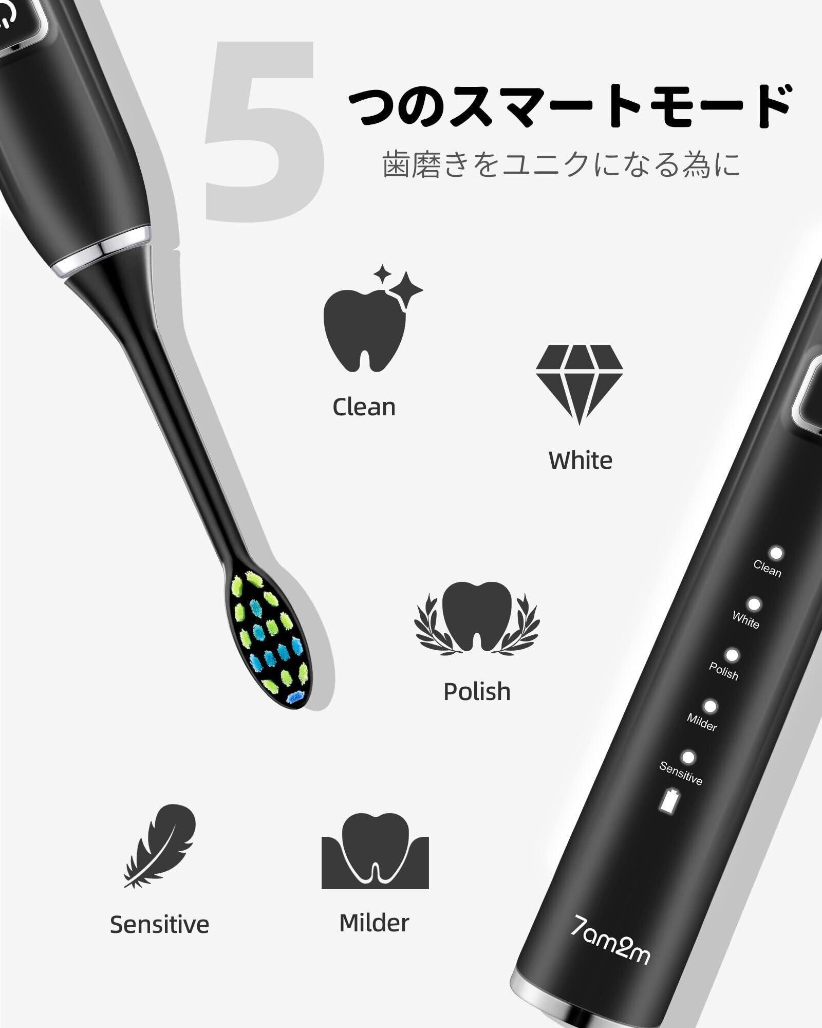 7am2m 電動歯ブラシ 超音波歯ブラシ ソニック 電動はぶらし振動 替えブラシ6本付き ワイヤレス急速充電 一回充電で90日使用可能 5モード 電動歯ブラシ磨き 2分間オートタイマー機能 IPX防水 低騒音 スマート歯磨き ブラック