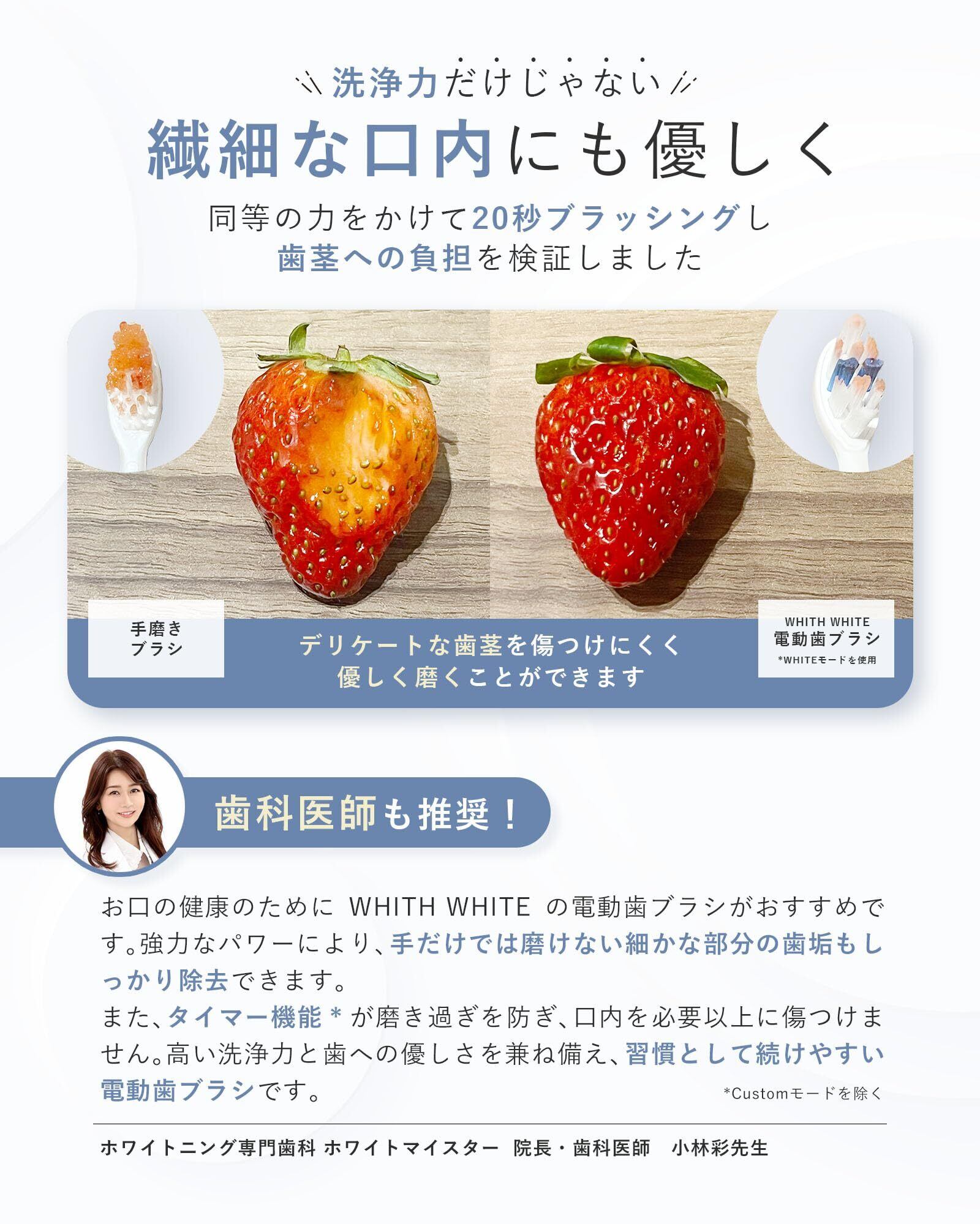 【 リニアモーター採用 】 約35,000-42,000回/分の超音波洗浄で、手磨きと比べ 『最大7倍* 』 の歯石除去力 を持つ 超音波電動歯ブラシ !(*自社調べ)手だけでは磨けない部分の歯垢もしっかり除去できます。
