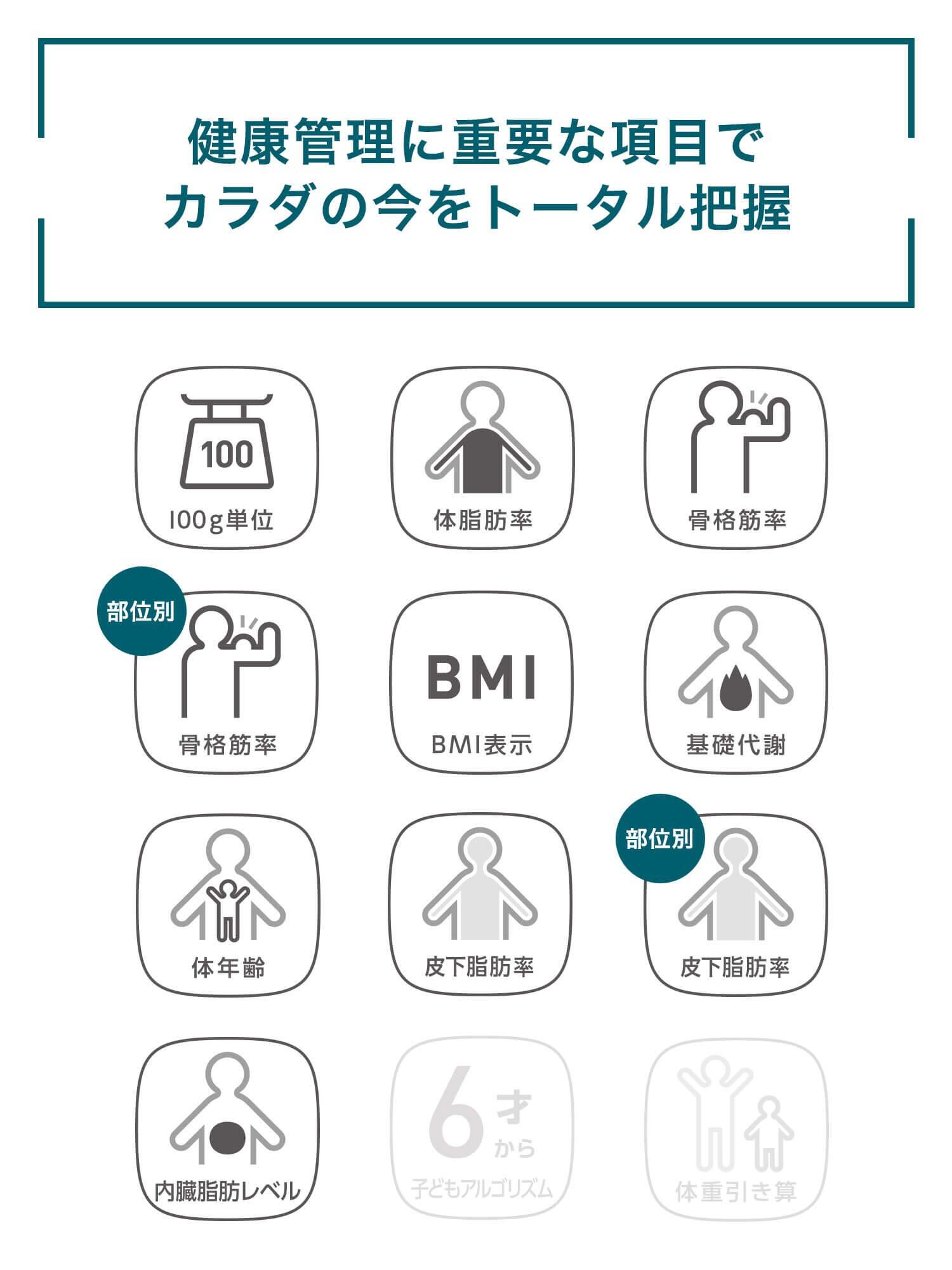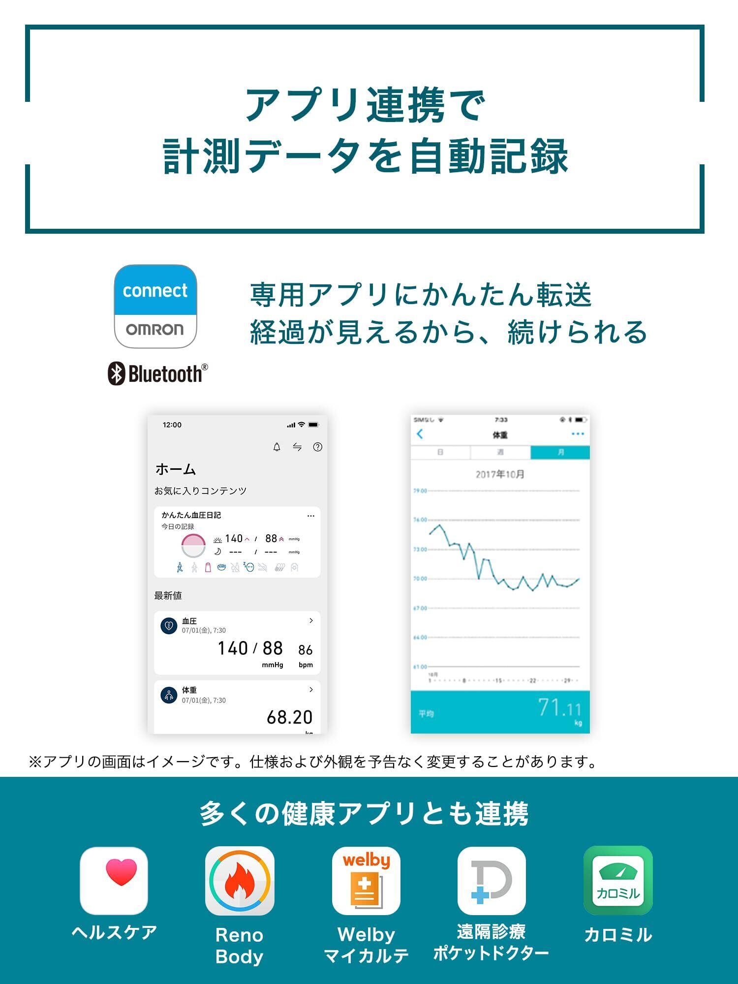両手と両足で測定するタイプの体重体組成計です。両手両足から全身に微弱な電流を流すことで、体幹・両腕・両足といった部位別の体組成が分かります。Bluetooth通信機能を搭載。iPhone/Android専用アプリ「OMRON connect」に、測定データを転送し、体重や体脂肪率、骨格筋などの測定データを簡単に確認・管理することができます。
