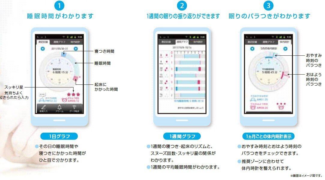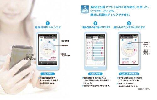 ねむり時間計で計測した日々のデータはAndroidスマートフォン用アプリ「ねむり体内時計」で管理。「ねむり体内時計」には、体内時計を整える機能が満載!楽しく続けることができる