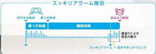 起きやすいタイミングでアラームを鳴らす【スッキリアラーム】機能も搭載。アラーム設定時刻前の体動から、眠りが浅くなったタイミングで優しく起こしてくれるので目覚めはスッキリ。布団からサッと出られ、二度寝も防ぐことができる