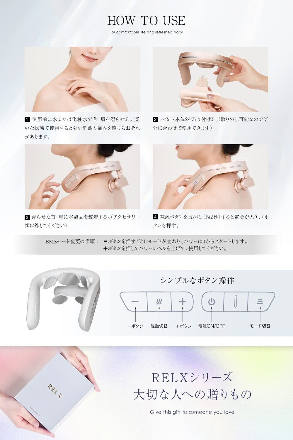 【使い方】①使用前に、水や化粧水で使用部位を湿らせる。(※お肌が乾いた状態で使用するとEMSの感じ方が異なるおそれがあります)②本体1・本体2を取り付ける。(お好みで取り外しも可能)③湿らせた首・肩に本製品を装着する。(アクセサリー類は外してください)④電源ボタンを長押し(約2秒)すると電源が入る。(約15分経つと自動でオフになります) 【メモリー記憶機能】強さレベルとモードは記憶されます。本体起動時、前回使用したEMSモード/強さレベルから始まります。