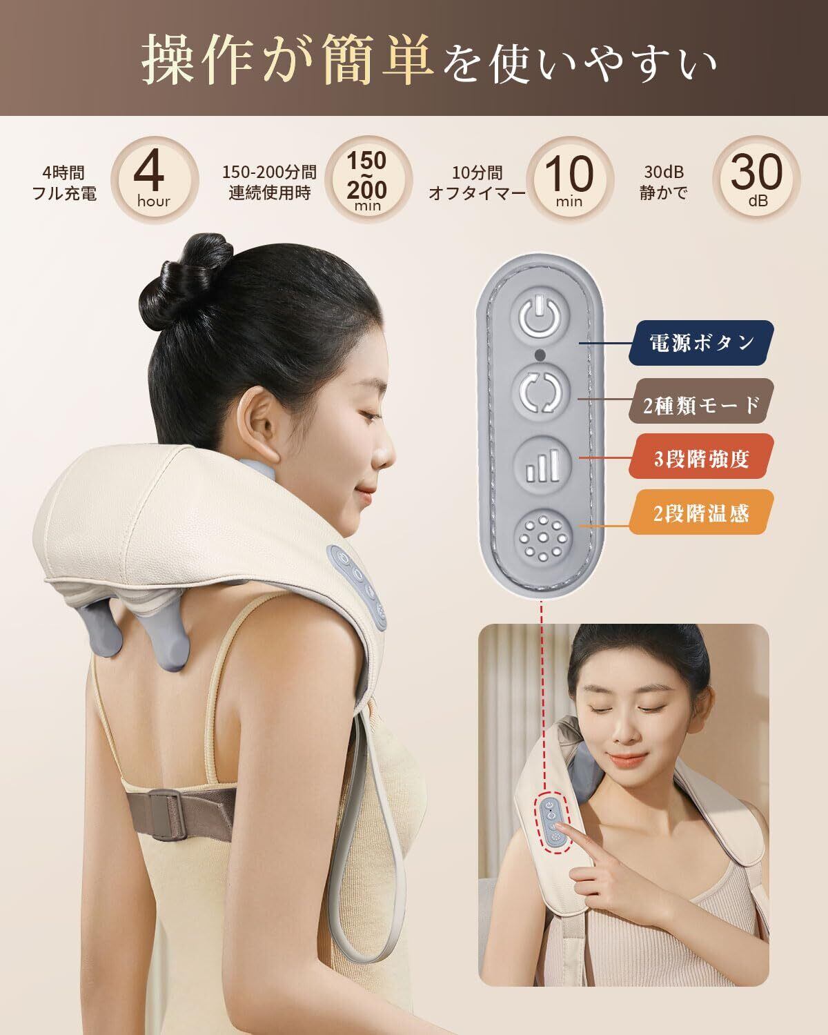 【コードレス設計・男女兼用】Type-C充電式のコードレス設計で、どこでも自由に使用可能。ソファでくつろぎながら、仕事の合間に、出張先でも便利。バックル付きのベルトでしっかり固定でき、両手を解放してリラックスできます。長さ調節可能なベルトで、首・肩・背中などにしっかり固定できます。人間工学に基づいた設計により、首の大きい方も小さい方も首にフィットします。体型を問わずお使いいただけ、ご家族みんなでお楽しみいただけます。ストラップの長さも調整可能で、お好みに合わせて調整できます。また手持ちベルトのゆるみによって強弱も調整できます。