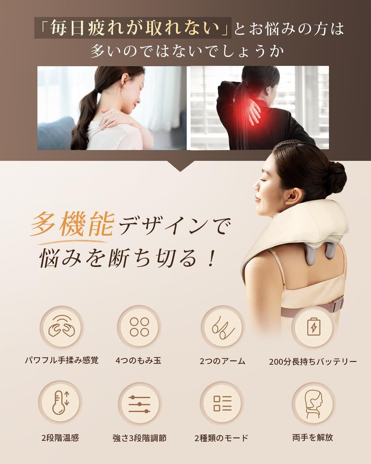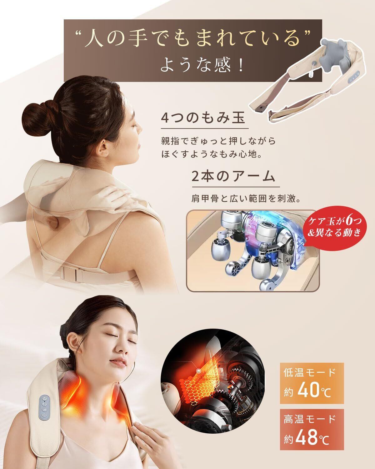 【広い範囲刺激・2段階温熱機能】ネックケアは、4つのもみ玉と2つのアームが首筋や肩口をしっかり捉え、もみ玉の立体的な動きとアームの上下の動きが絡み合った多彩なもみ技で、1度に首〜肩甲骨と広い範囲を刺激、筋肉のコリを和らげます。また、2段階温熱機能も搭載しており、トータルケアも可能です。必要に応じて温熱のオフも可能です。