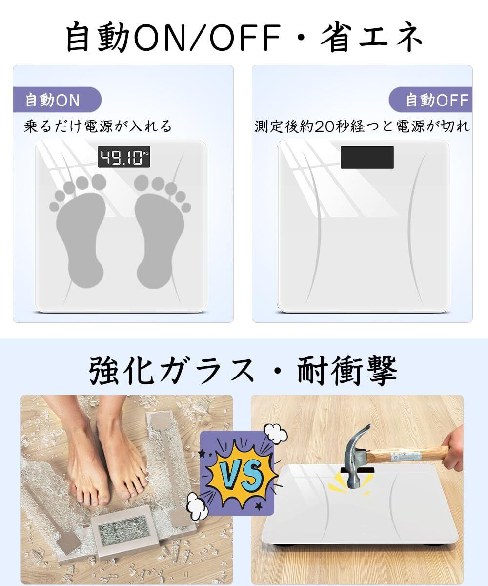 【新登場・高精度・薄型】 体重計 ヘルスメーター 乗るだけ 電源自動ON/OFF バックライト付 ボディスケール 180kgまで対応 ボディスケール 強化ガラス 電子スケール コンパクト 軽量 電池付属 (ホワイト)