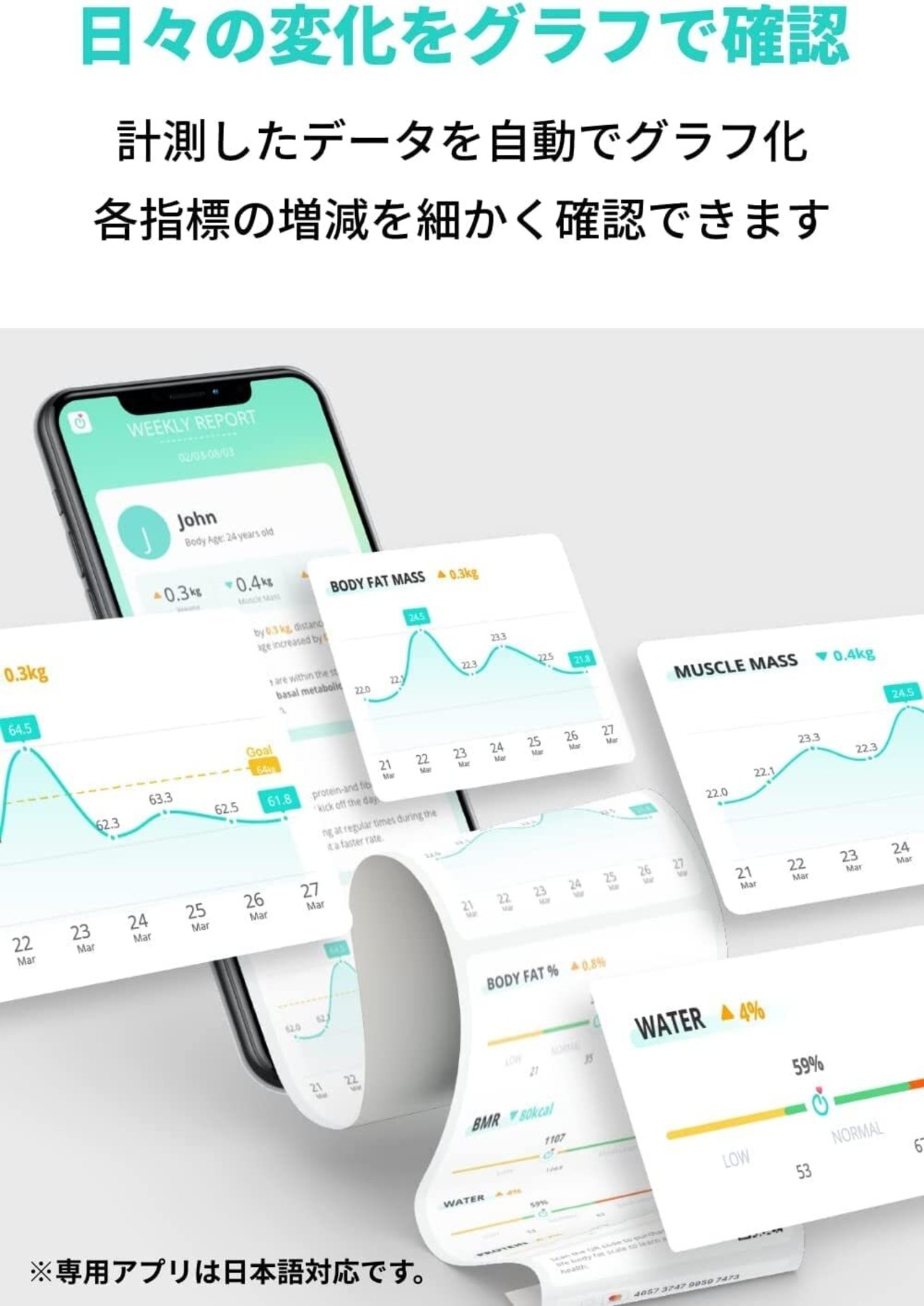 アプリへのデータ連携:AppleのヘルスケアやGoogle Fit、Fitbitと同期することで、データをまとめて管理できます。専用アプリではデータのグラフ表示や、目標に対しての進捗を管理できます。