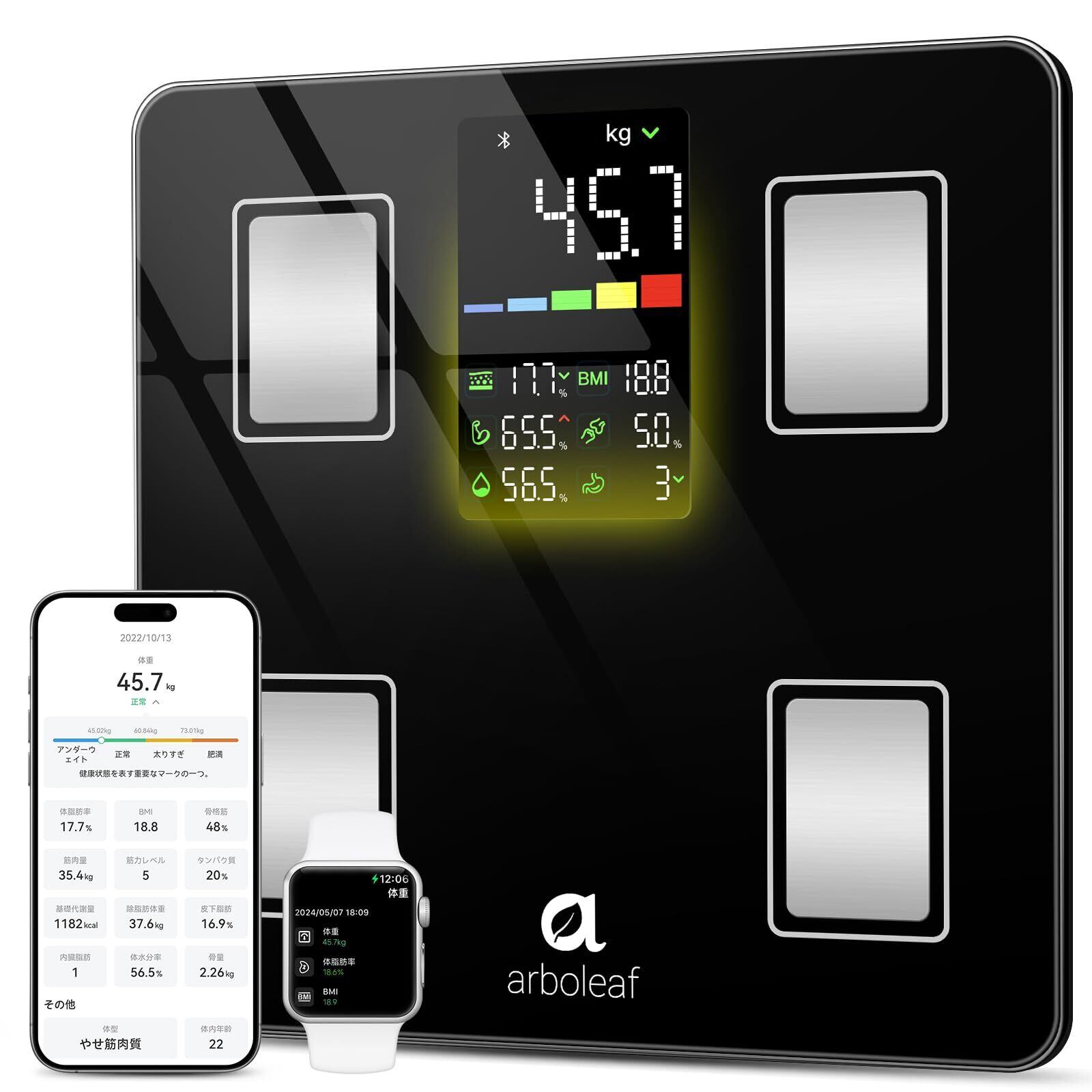 arboleaf 体重計 スマホ連動 体脂肪計 体組成計 ヘルスメーター 高精度 あすけん連携 乗るだけ 180kgまで 14項目測定 体脂肪率/基礎代謝量/水分量/体内年齢/筋肉量/BMIなど【Fitbit/apple watch/GoogleFit/あすけん/appleヘルスケア連携】Bluetooth対応 家族一気に測定 日本国内サポート