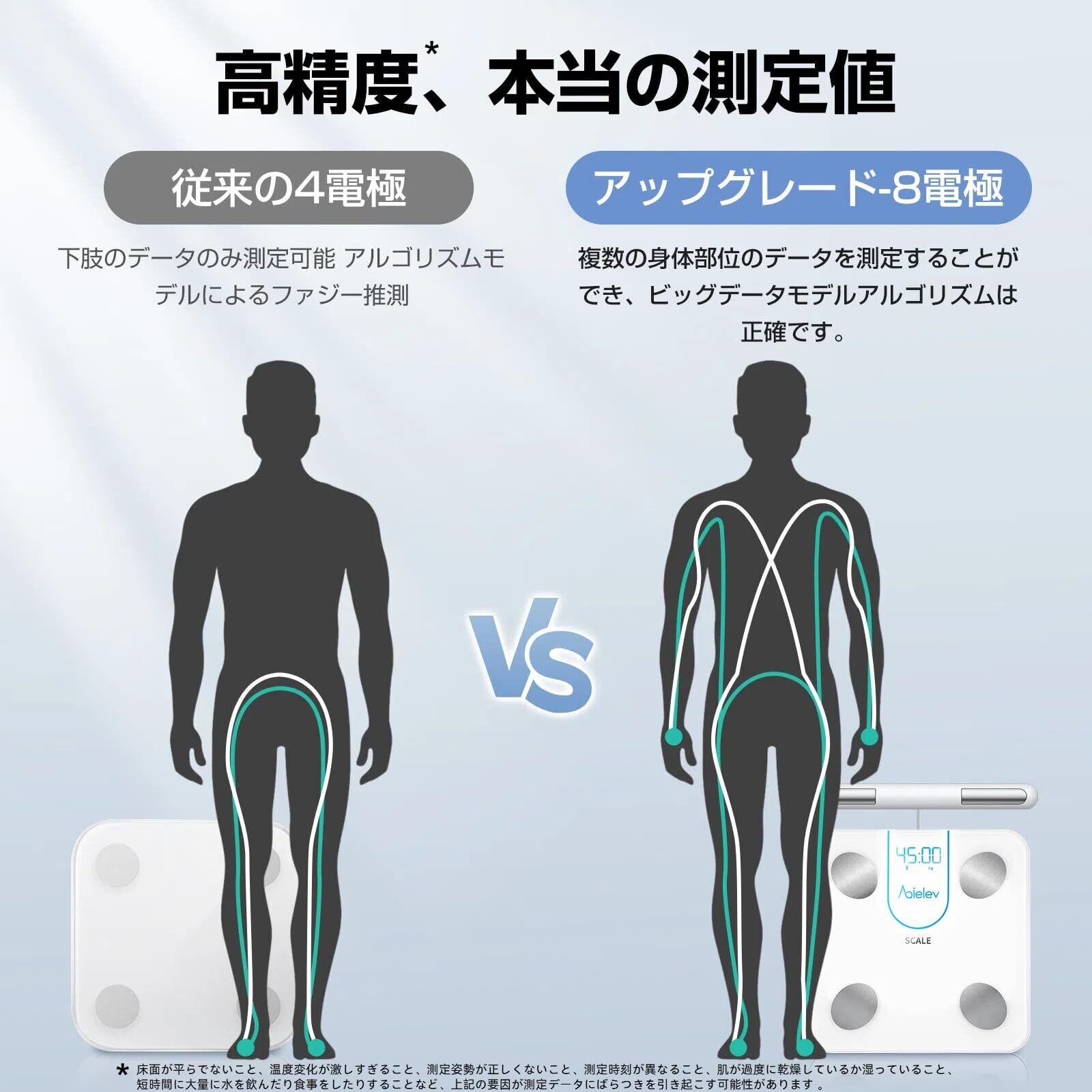 【なぜ 8 電極家庭用体組成計を選ぶのか?】AQielev専門版体重·体組成計は、老人、子供、妊婦、アスリート、ボディビルダーなど、様々な方に正確な体成分情報を提供します。日常健康モニタリングに不可欠。通常体重計は体重しか測れず、ダイエットに重要な体脂肪率は把握できない。安価な体組成計は偽電極片や安チップを使い、データが不正確。この 8 電極体組成計なら安心、正確なデータで健康管理をサポート